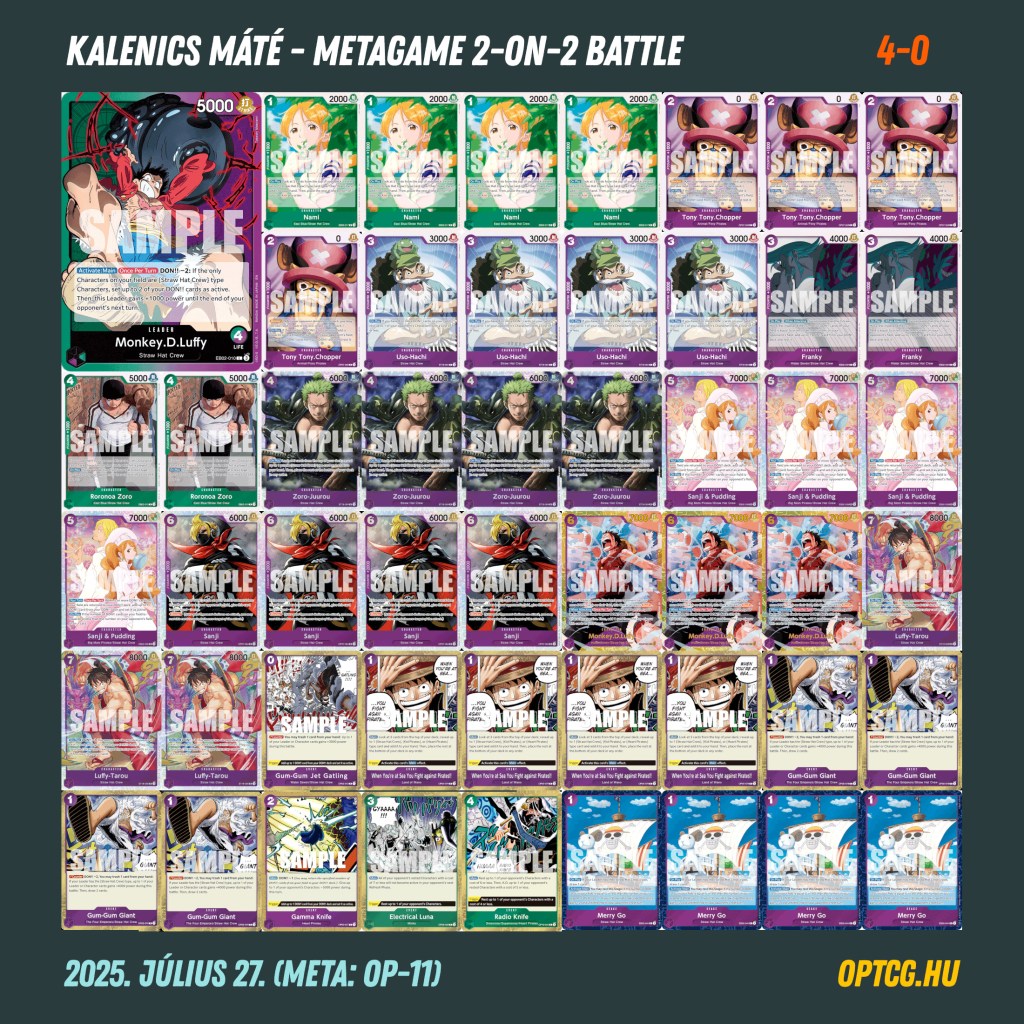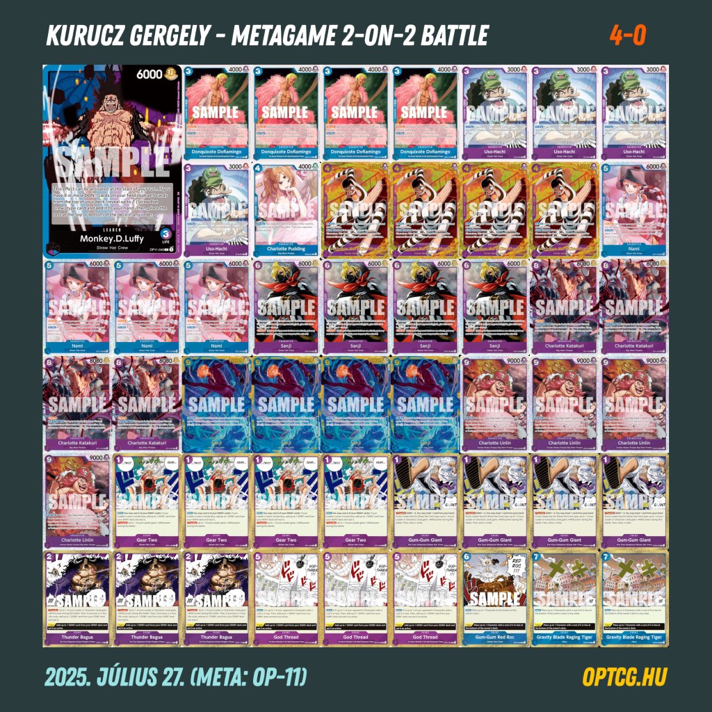 A négyfordulós versenyen a Kalenics Máté (GP Luffy), Kurucz Gergely (UP Luffy) páros megállíthatatlannak bizonyult, mindketten behúzták mind a négy meccsüket, így maximális, 20 pontos eredménnyel nyerték meg a versenyt (Kurucz Gergely ezzel duplázott a formátumon, ezúttal új párral az oldalán). Mögöttük szoros eredmény született a további díjazott helyekért, 1-1 pont választotta csak el egymástól a csapatokat, ami pedig mindenképpen említésre méltó, hogy a 10 játékos 9 különböző paklit forgatott.