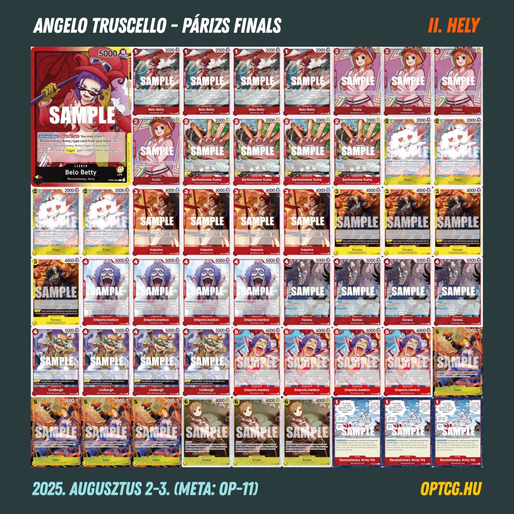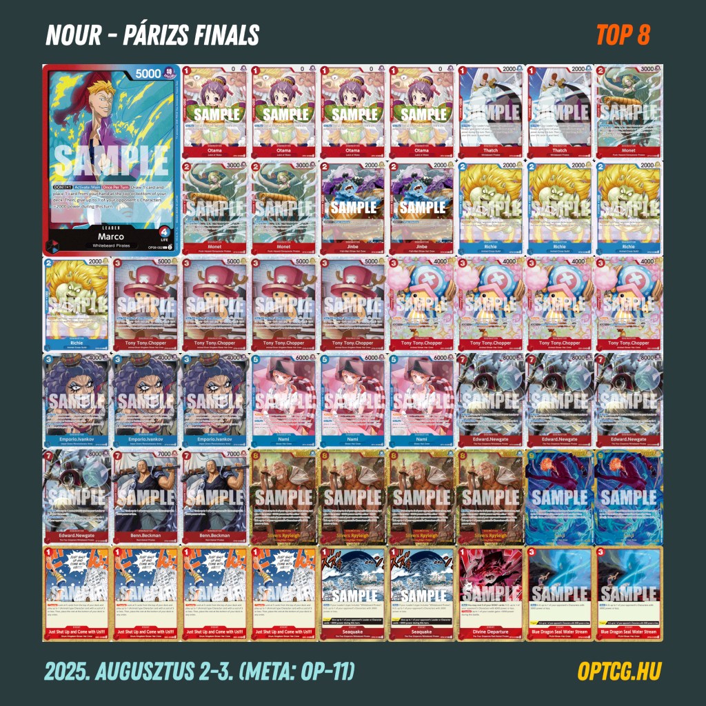 Az nem volt különösebben meglepő, hogy a Belo Betty és az UP Luffy voltak a leginkább reprezentált deckek a rájátszásban, ahol egyébként igen színes mezőny jött össze, nem kevesebb mint 14 féle Leaderrel. Az viszont már annál inkább meglepő volt, hogy a Top 8-ig egyik kék-lila Luffy (sőt, semmilyen Luffy Leader!) nem jutott el.
