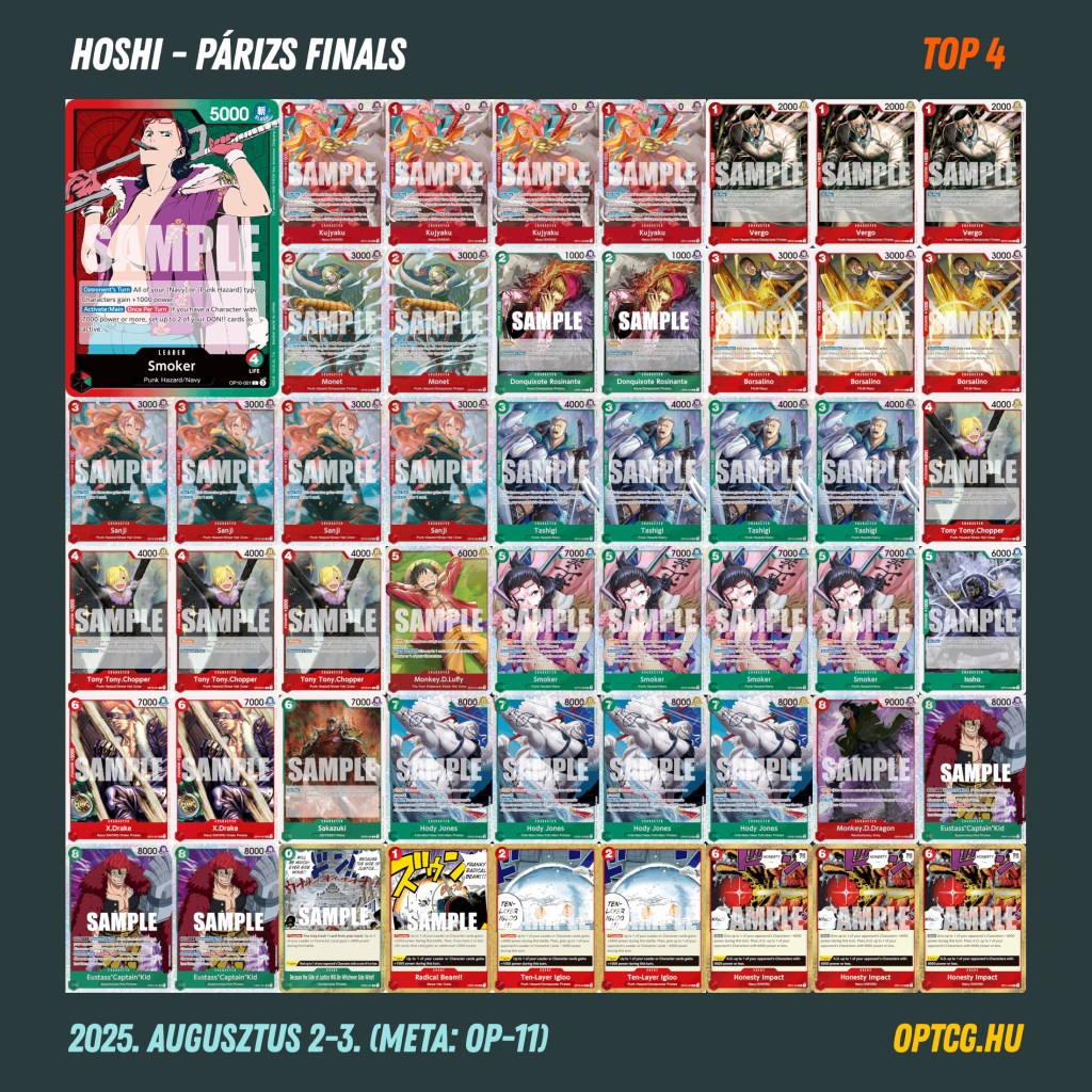 Néhány hetes pihenőt követően alaposan berobbant a nemzetközi versenyélet a One Piece Card Game háza táján, hétvégén ugyanis három nagy versenyt rendeztek Párizsban. Ezek közül a legfontosabb a szombati Finals volt, ahonnan az első kettő kvalifikálhatott a jövő évi világbajnokságra, de ezt megelőzően pénteken tartottak még egy Last Chance Qualifier tornát is, ahonnan végül a Top 128 jutott be a Finalsre. Akiknek pedig ezek nem jöttek össze, azok a párhuzamosan zajló első Season 2 Regionalon indulhattak.