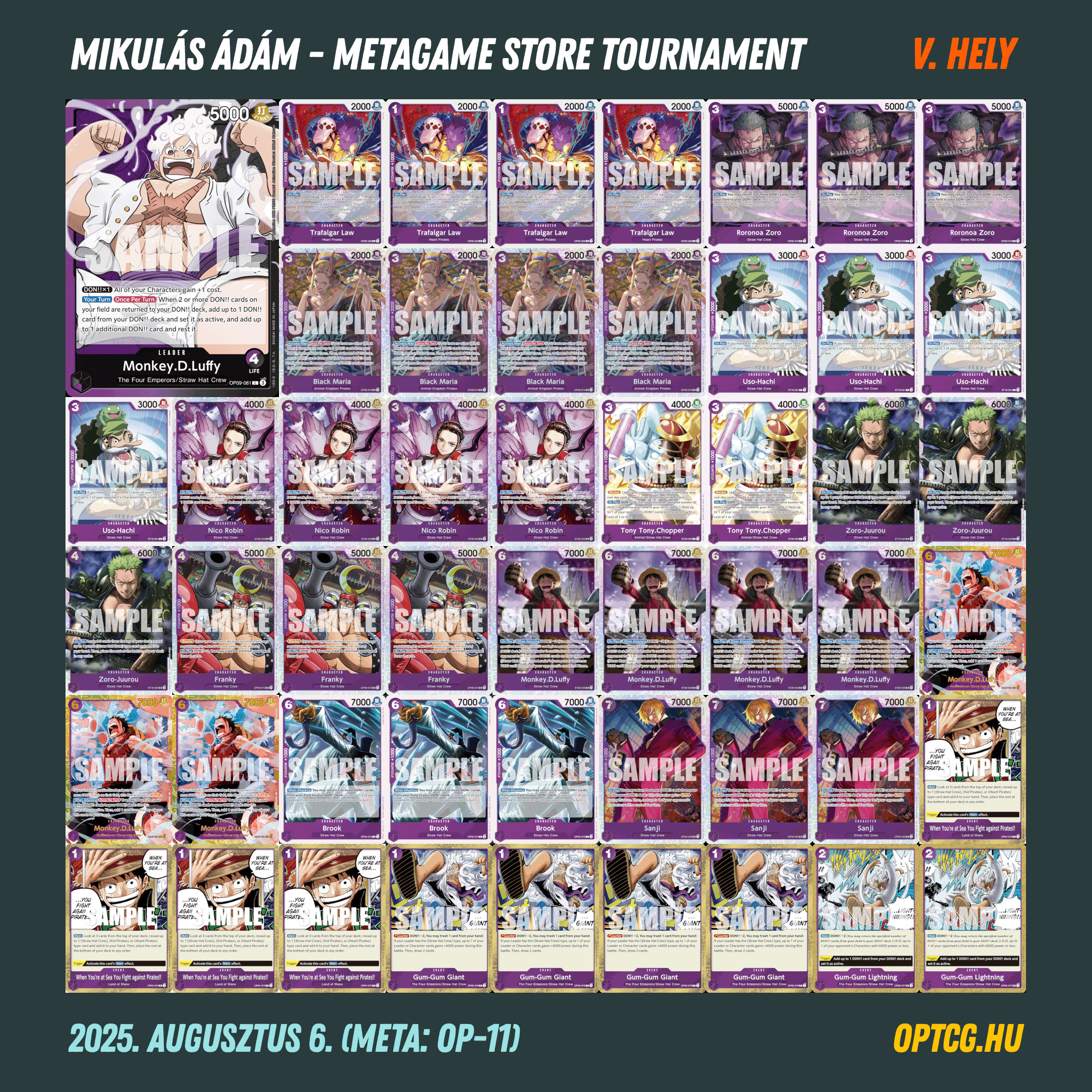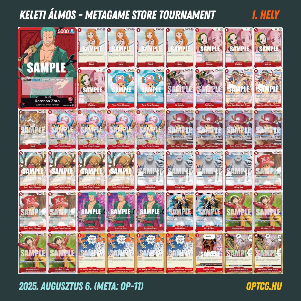 Az ötfordulós verseny – nem meglepő módon – változatos élmezőnyt és szokatlan döntőt hozott: egy piros Zoro és egy sárga Kid csapott össze a fináléban. A győzelmet végül előbbi szerezte meg Keleti Álmos vezényletével, a 4-1-es helyekre pedig egy-egy Marco, Yamato és BP Luffy ért még oda ezúttal. Többeket megihlettek tehát a leugutóbbi Finals / Regional versenyek, hiszen ezen Leaderek közül több is toppolt a nagy hétvégi tornákon.