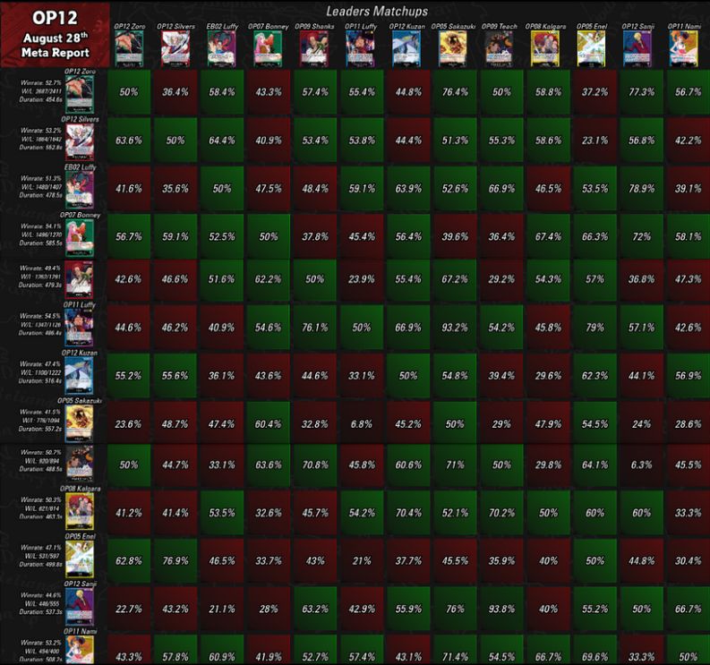 A TCG Match Making közzétette legfrissebb kivonatát a One Piece Card Game aktuális metájára vonatkozóan, melynek alapját az OPTCGSim ranked módja, az OPBounty adja. Rovatunkban mi is kizárólag a publikusan elérhető információkra hagyatkozunk – aki még részletesebb statisztikákra kíváncsi, az támogassa őket a Patreonon, és hozzáférést kap a teljes adattáblához.
