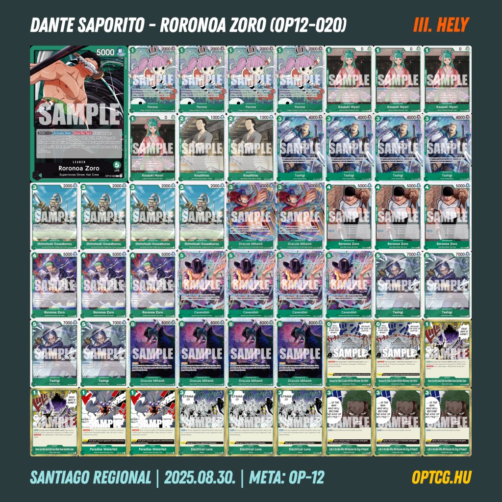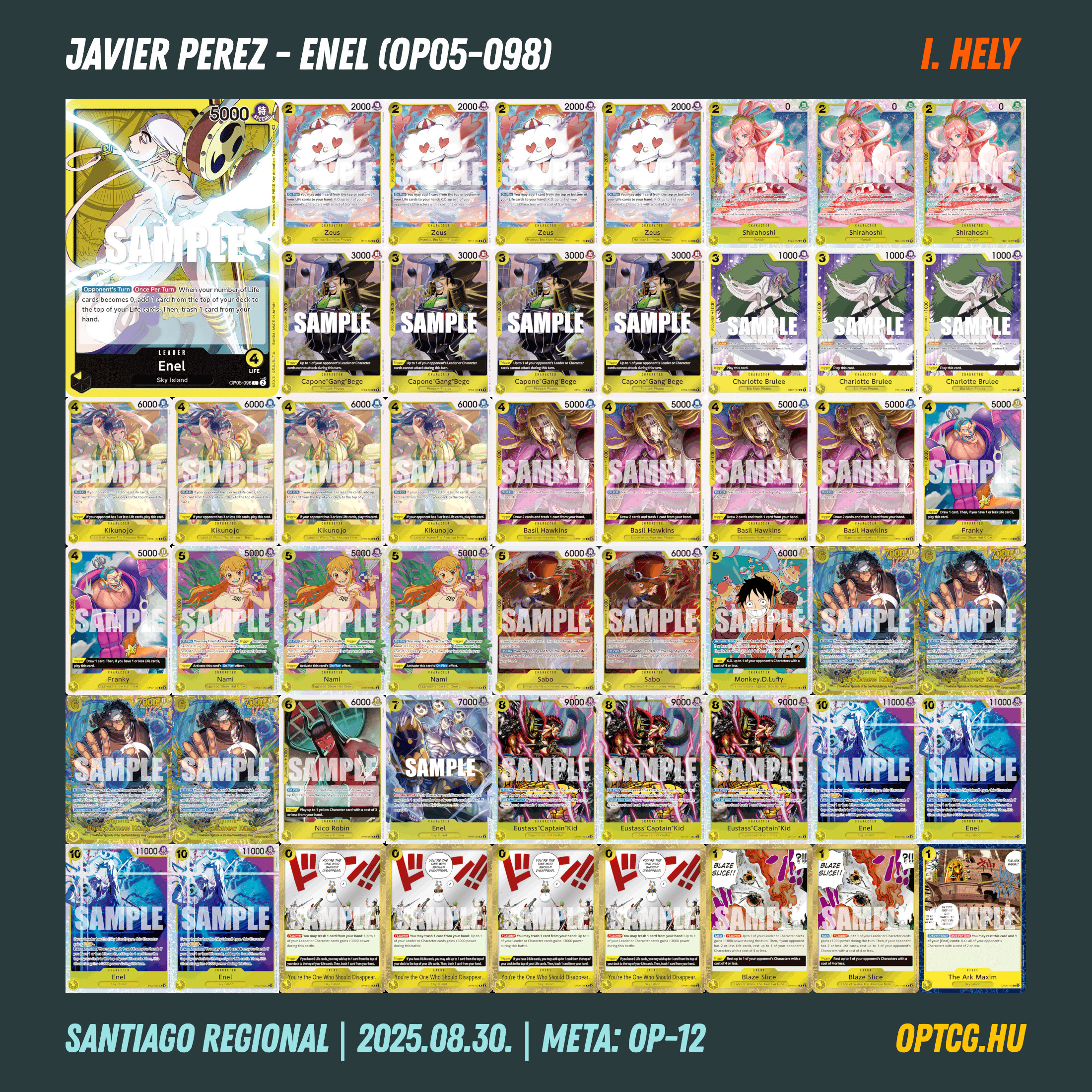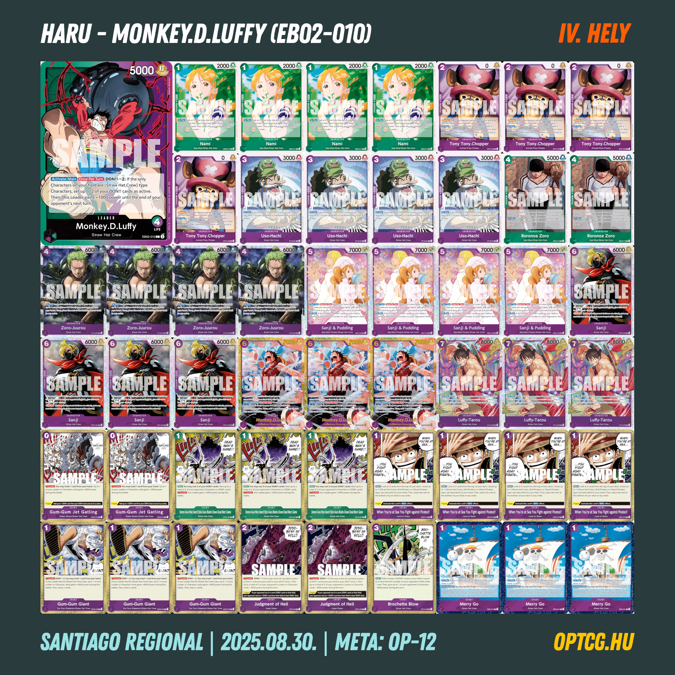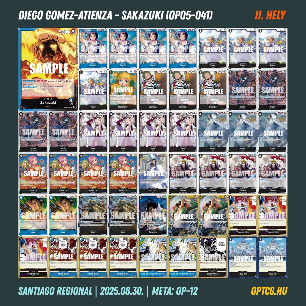 Az élmezőny igen érdekesen alakult, az első nyolc helyen ugyanis csupa különböző Leader végzett – a két legjobb pedig egészen az OP-05 metáig repít vissza bennünket, egy-egy Enel és Sakazuki végzett ugyanis a dobogón egy zöld Zoro társaságában. A megerősödő sárga szín egyik képviselője, a kompetitív metába visszaengedett régi kedvenc, illetve egy új Leader is odaért tehát az első háromba. Mögöttük egy-egy GP Luffy, UP Luffy, Rayleigh, Shanks és Bonney zárt – az első négy helyezett listáját lent láthatjátok (további listák a szervező Play Latam oldalán).