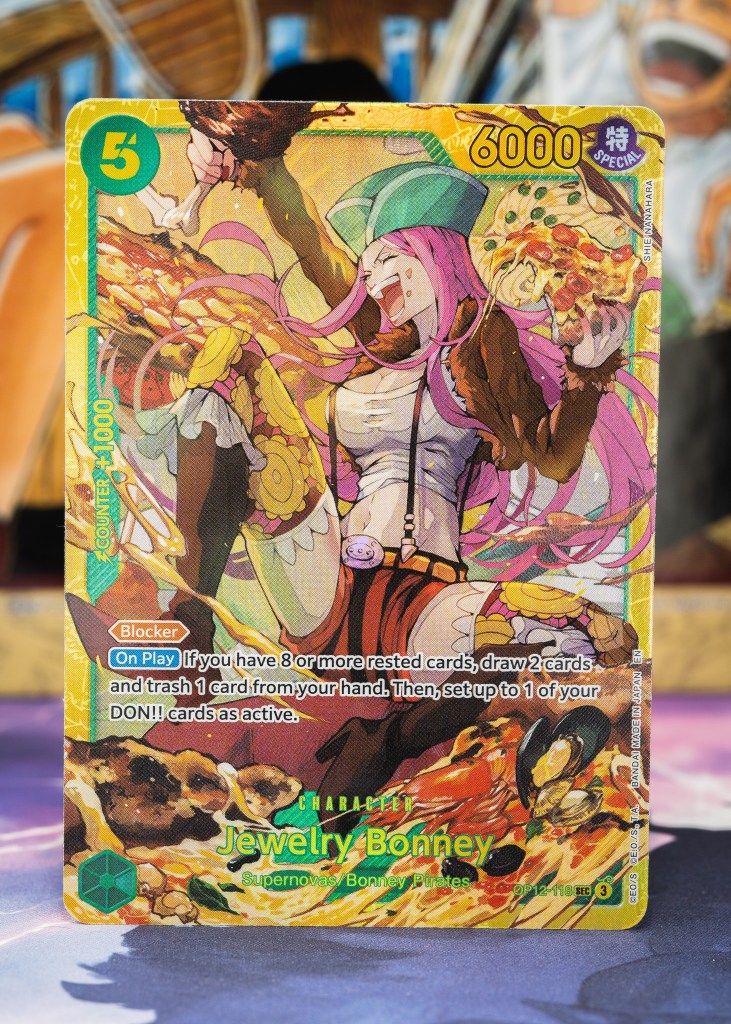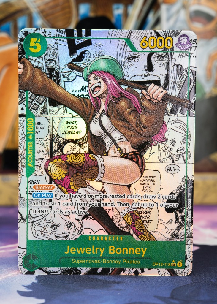 A címet értse mindenki úgy, ahogy szeretné, az mindenesetre jó ideje látszik, hogy a piac szereti azokat a szetteket, amiknél nem a manga a teteje a bontható lapoknak. Jewelry Bonney ezen verziója egyébként a maga 250 eurós induló árával némileg alatta van annak, amit az elmúlt néhány szett mangái tudnak, emelkedésre azonban középtávon bőven van esély – egyrészt azért, mert több manga is leírta már ezt az ívet, másrészt pedig azért, mert maga a lap is játszott. A top hit mindenesetre nem ő, hanem a kétféle változatban nyitható 3rd Anniversary Teach, melyből az ezüst verzió 430 eurótól, az arany pedig 670 eurótól indul jelenleg. Nem az a szint, mint az OP-11 esetében, de Luffy mindig nagyobb hype-ot kap – meg hát így sem leszünk szomorúak, amikor kibontunk két kilót egy boosterből…