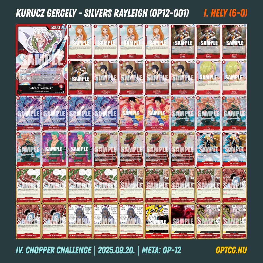 A hatfordulós versenyt végül Kurucz Gergely nyerte Rayleigh-vel, aki igencsak erős hetet zárt így, hiszen a csütörtöki Conqueror’s Cup online eventen is ő győzedelmeskedett. Regional-tornákon is villantott már korábban, így abszolút érett már, hogy átkerüljön ő is a “profi” listára – az első hellyel ez most megtörtént. A dobogós helyeken szintén OP-12-es Leaderek zártak, de nem feltétlenül azok, amelyekre számítanánk: Stefán Lázár Koalával, Bietry Kevin pedig Sanjival ért oda – mellettük egy-egy Shanks és Nami, valamint két Teach zárt még 5-1-es eredménnyel.