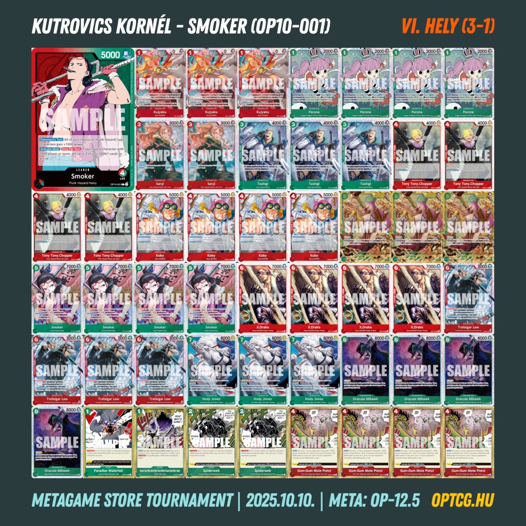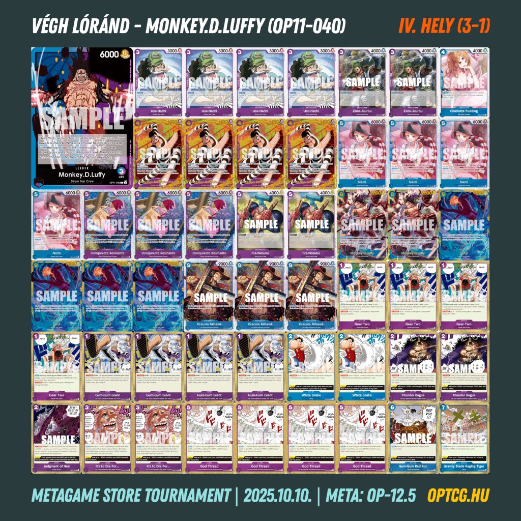 A négyfordulós versenyt végül Fábián Gergely nyerte, méghozzá GP Luffyt forgatva, megelőzve Rakovszky András zöld Zoróját, aki kizárólag a győztessel, illetve szintén 3-1-gyel záró ellenfelekkel játszott. Egy vereséggel odaért még az egyik lila Katakuri és az egyik UP Luffy, de láthattunk egy kis RG Law fellángolást is, illetve a komoly buffot kapó RG Smoker is odaért az élmezőnybe.