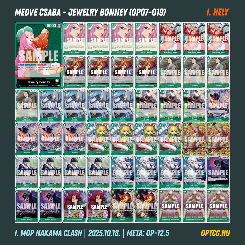A top meta pickek helyett sokkal inkább a személyes kedvencek domináltak tehát, legalábbis ami a pakliválasztást illeti, a versenyt azonban végül az elmúlt hetek első számú hazai sikergyárosa, Bonney nyerte meg, méghozzá Medve Csaba irányításával. A képzeletbeli dobogóra Ács Gábor és Szilágyi János állhattak még fel Vegapunkkal, illetve lila-fekete Luffyval.