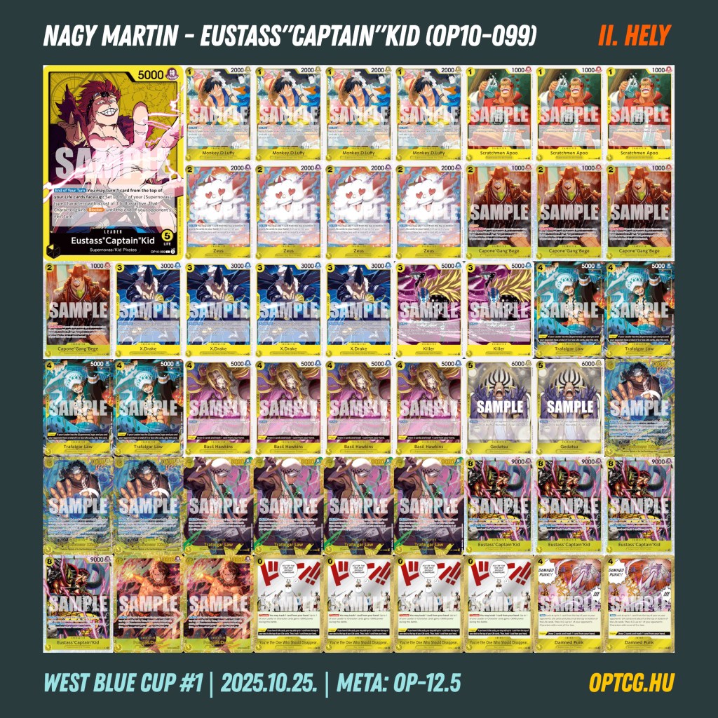 A versenyt végül Várhegyi Ádám nyerte UP Luffyval, aki mögött Nagy Martin és Cseh Christopher zártak sárga Kiddel, illetve kék Doffyval. Paklilistáikat lent láthatjátok – gratulálunk a játékosoknak, és persze a szervezőknek is, reméljük, hogy hasonlóan szép létszámokkal mennek majd a jövőbeli versenyek is!
