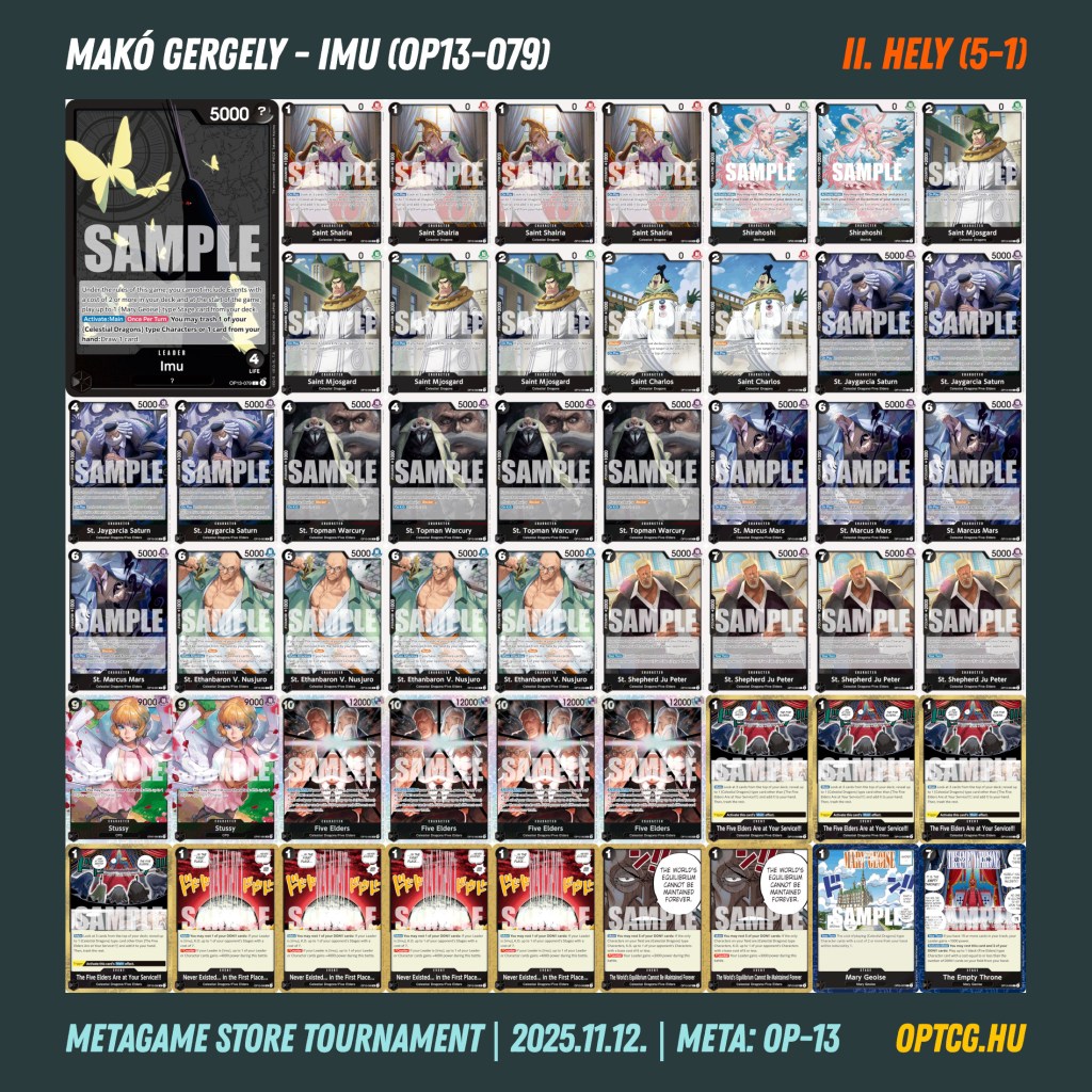 A 15 (!!) darab Imu (ez 43 százalékos használati arányt jelent) olyasvalami, amihez még csak hasonlót sem láthattunk eddig a hazai metában. Úgy tűnik, hogy a nyilvánvalóan top tier, emellett pedig fillérekből összeállítható fekete deck sokak számára szimpatikus választás, mellette “csak” 5 Ace, illetve 3 Zoro volt a mezőnyben – rajtuk kívül további 7 féle Leader bukkant fel.