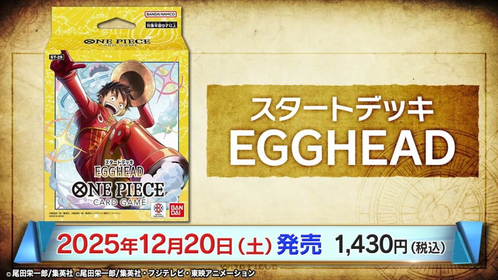 Közeleg az ST-29 leleplezése. A következő Starter Deckről annyit már eddig is tudtunk, hogy Egghead tematikájú lesz, benne egy sárga Luffy Leaderrel, most azonban kiderült, hogy november 27-től kezdik majd bemutatni a lapokat. A megjelenés többé-kevésbé globális lesz: Japánban december 20-án, nálunk pedig január 16-án debütál az új kezdőpakli, angol nyelven Ultra Deck formátumban.
