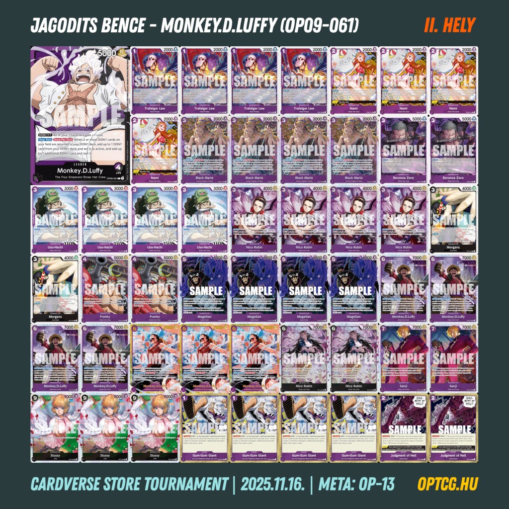 A Cardverse szervezésében november 16-án ismét One Piece lokált tartottak Szombathelyen, melyen ezúttal 12 játékos vett részt, a meta deckeken kívül meglepő választásokat is tartogató környezetben.
