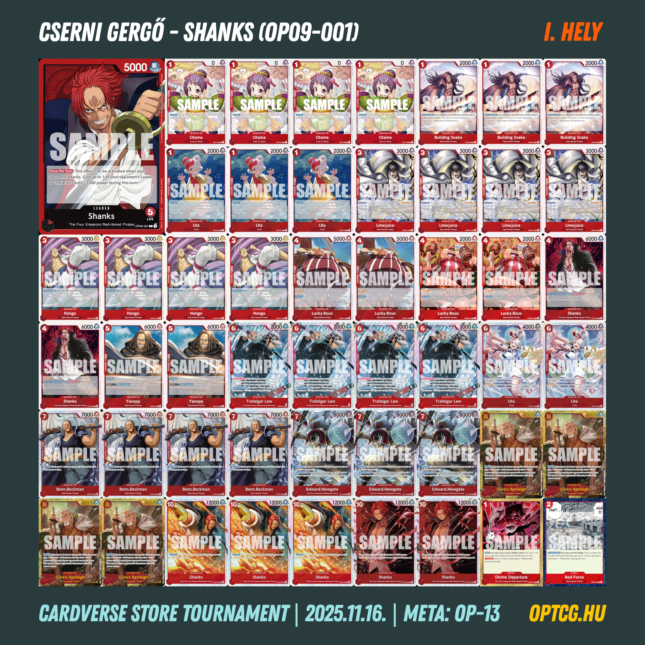Végül sikerült is némi borsot törni a top koncepciók orra alá, a győzelmet ugyanis egy Shanks szerezte meg Cserni Gergő révén, a képzeletbeli dobogóra pedig egy-egy BP Luffy és zöld Zoro állhatott még fel, ami mindenképpen szokatlan eredmény az új metában. Gratulálunk a helyezetteknek, paklilistáikat lent láthatjátok! A Cardverse legközelebb most vasárnap várja a One Piece-játékosokat, méghozzá Store Treasure Cup versennyel.