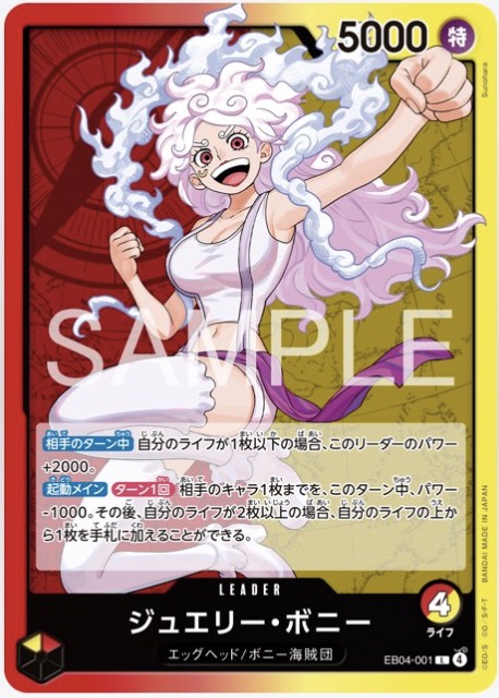 Egghead / Bonney Pirates[Opponent’s Turn] If your Life is 1 or less, this Leader gains +2000 Power.