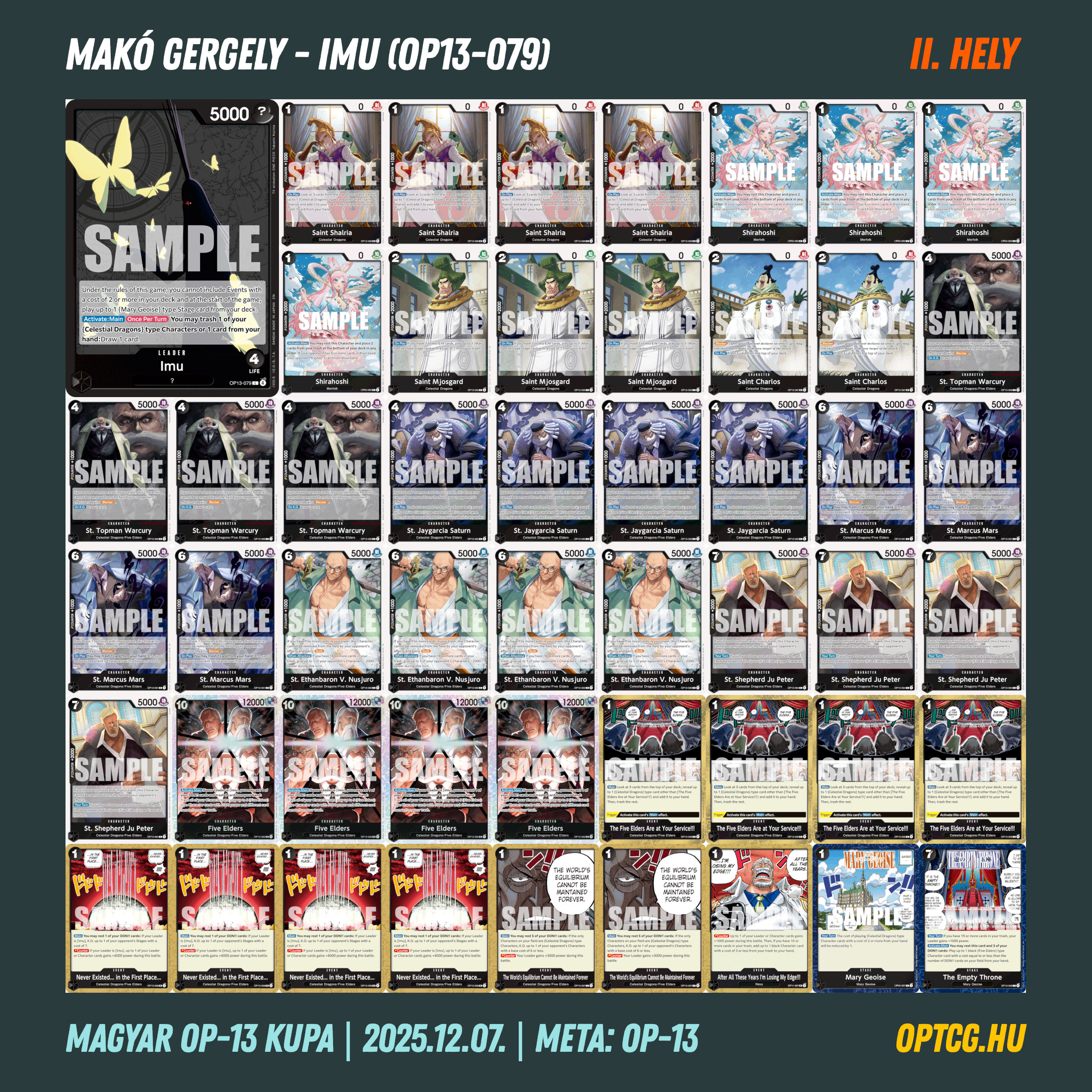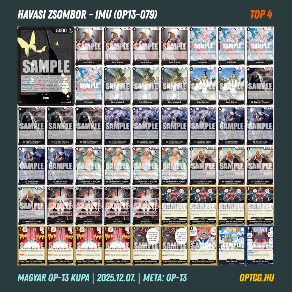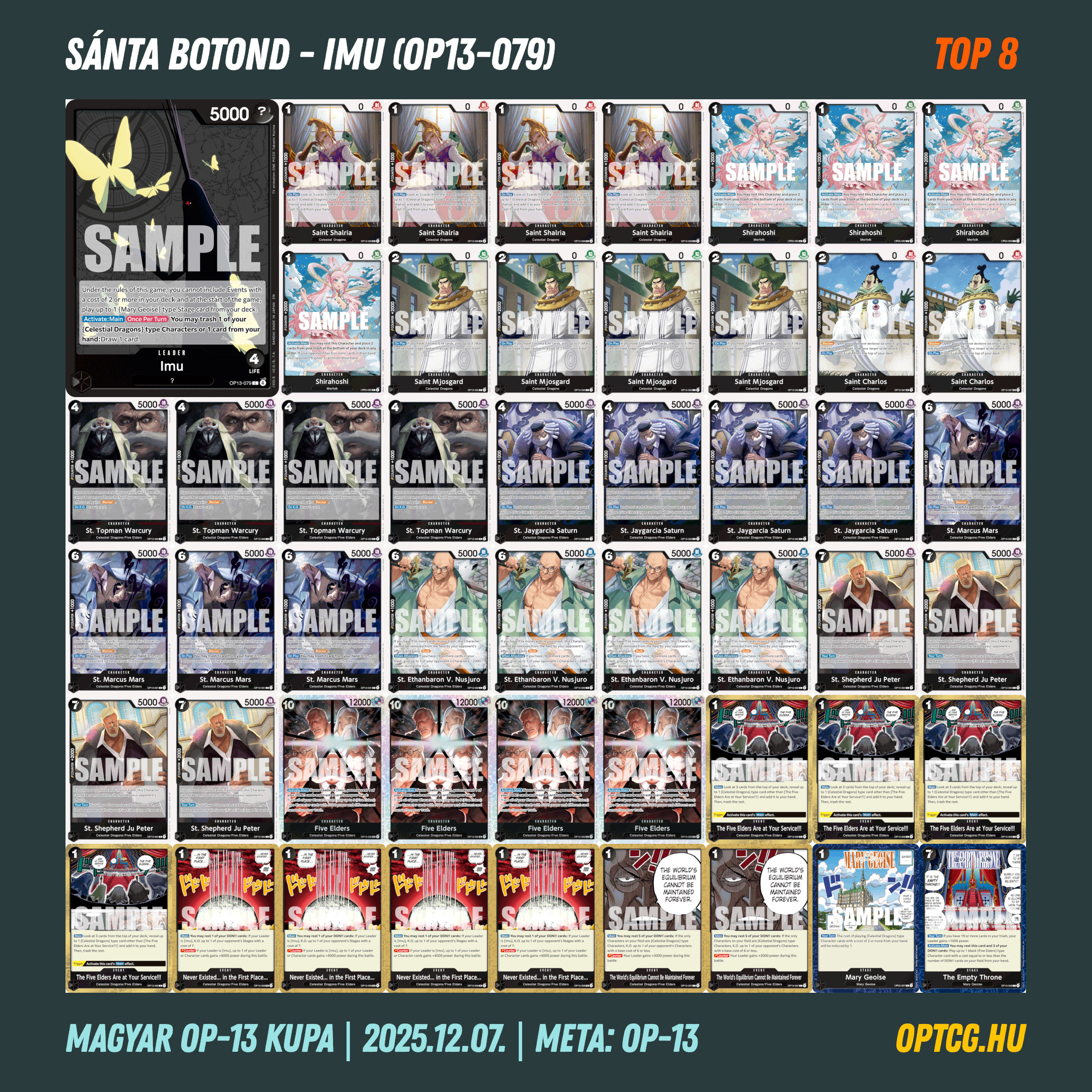 Gratulálunk Máténak és a többi top cutosnak, paklilistáikat lent láthatjátok. Ami pedig a közösséget illeti: nem kell sokat várnotok 2026 első alanoros One Piece-versenyére, január 3-án ugyanis az V. Chopper Challenge-dzsel várunk benneteket – a kezdő és amatőr játékosokat a main, a profikat pedig a side eventen, ahogy azt már megszokhattátok. Részletek hamarosan!