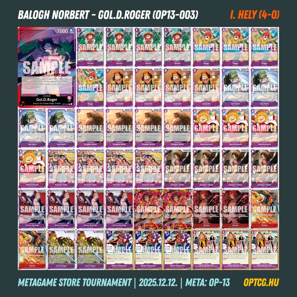 Kivételesen nem hagyományos formátummal várta a Meta Klub a One Piece-játékosokat a december 12-i lokálon, a jelenlegi játékkörnyezet három csúcsragadozója, Ace, Imu és a zöld Zoro tiltottak voltak ugyanis, így a megszokottól merőben más metában küzdhettek meg a játékosok a nyereményekért. Bár több mint 20 fős magyar különítmény utazott Düsseldorfba, így is összejött 13 fő a versenyre, ők az alábbi paklikat forgatták: