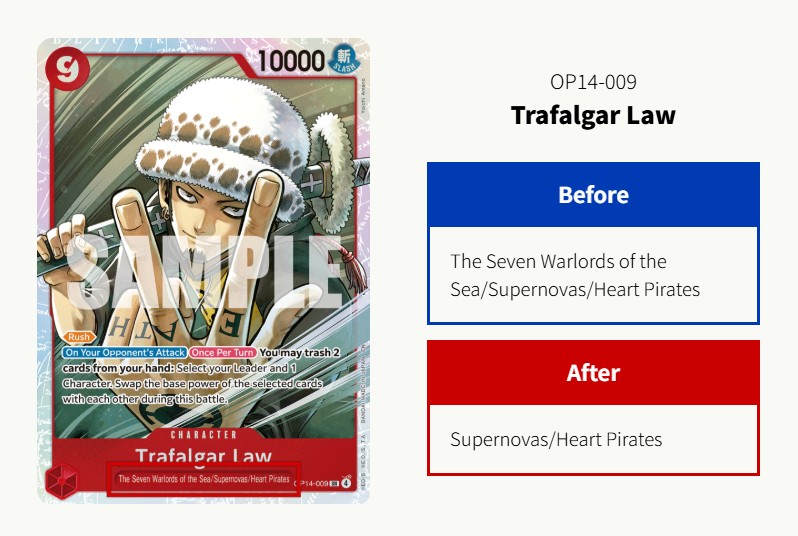 Erratát kapott a Trafalgar Law (OP14-009). Sajnos ebbe a kiegészítőbe is csúszott egy kisebb hiba: a nyomtatott verzió véletlenül kapott egy The Seven Warlords of the Sea típust is (a normál és az AA verzió is). Ez azonban nem érvényes: a karakter kizárólag Supernovas és Heart Pirates típusúnak tekintendő. Az OP-13-ban erratázott lapokkal ellentétben ebből sajnos nem lesz javított változat jelen állás szerint.