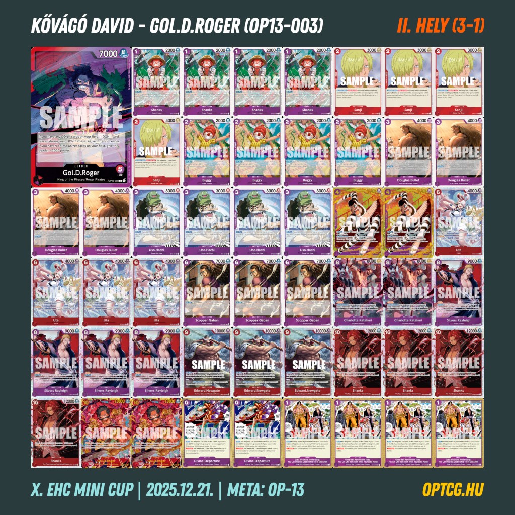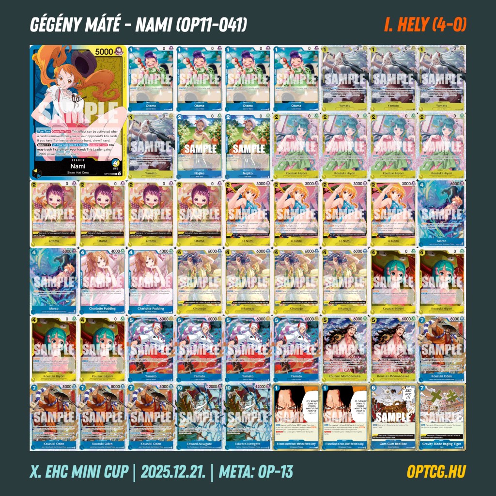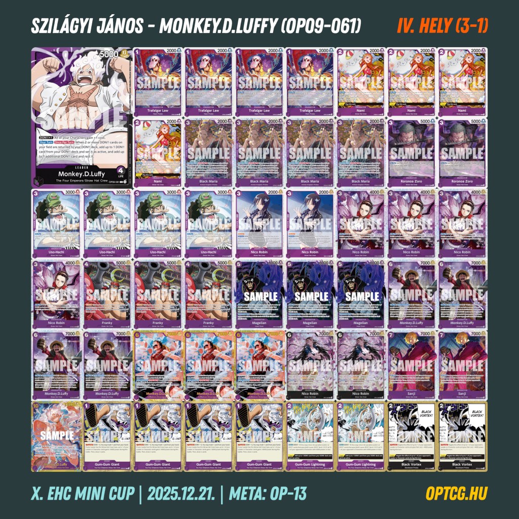 A december 21-i évzáró versenyen egyik deck sem ért oda a nagy trióból: az első helyet itt Gégény Máté szerezte meg Namival, egy-egy Rogert, lila Katakurit és lila-fekete Luffyt maga mögé utasítva.