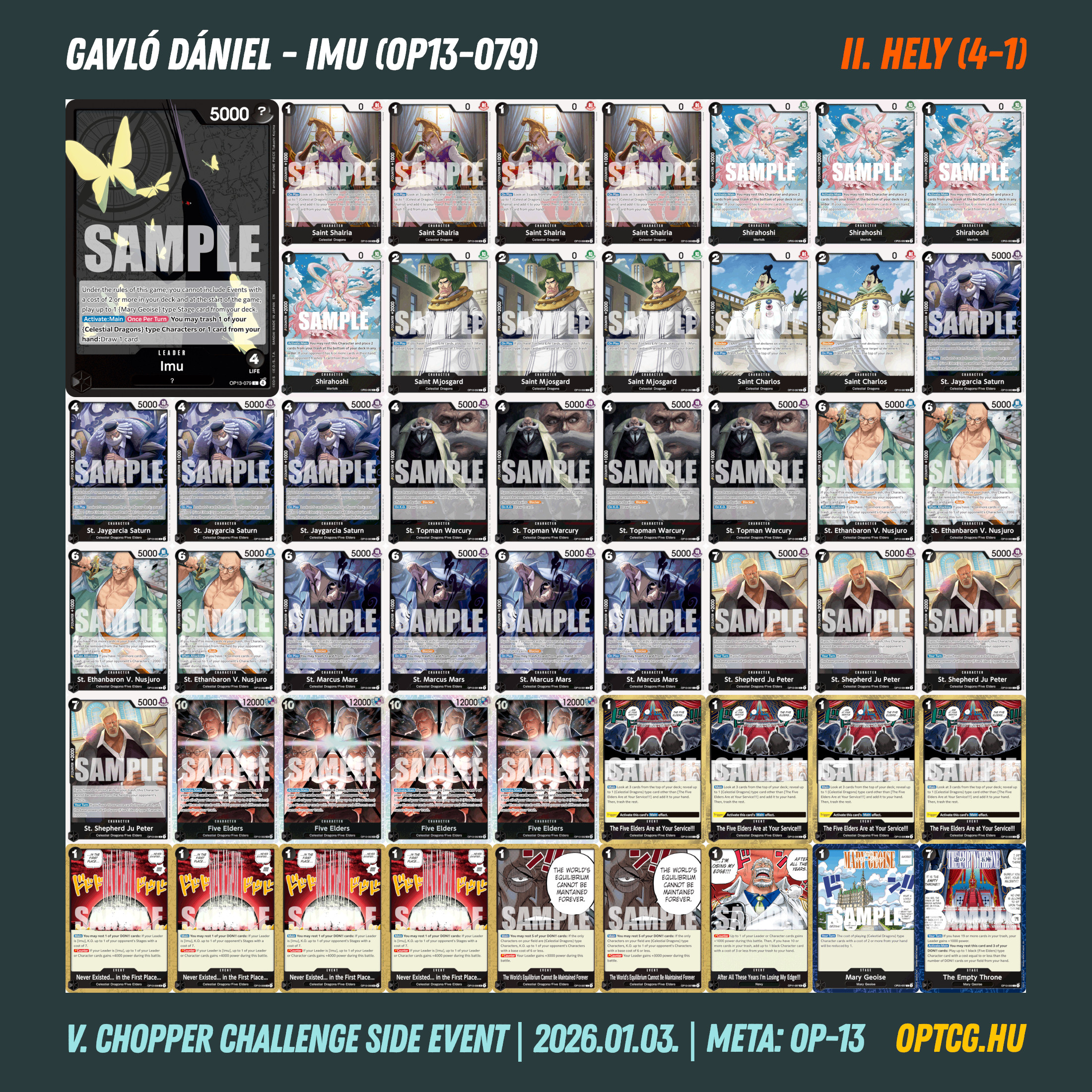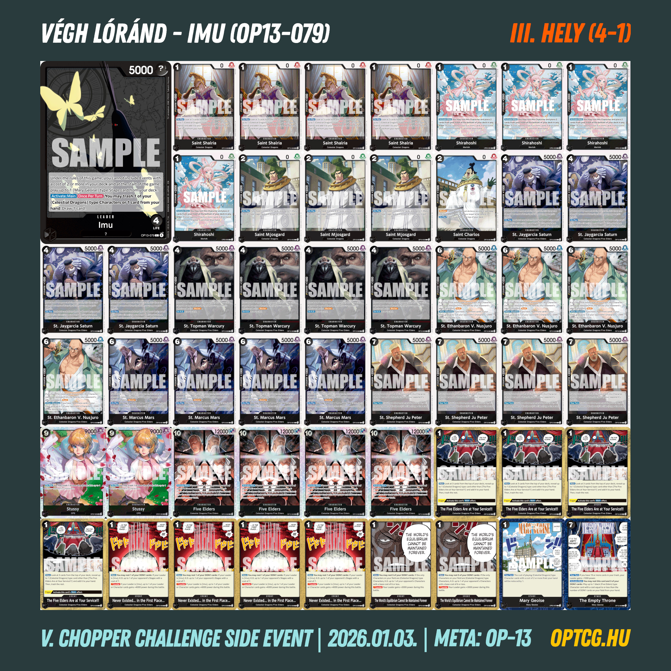Imu vagy Ace, ez volt tehát a fő kérdés, mindössze öten vállaltak be másik Leadert, de végül valóban az OP-13 meta két gigásza bizonyult jó választásnak, az élmezőnybe ugyanis csak ők fértek oda. A győzelmet Gergely Ferenc szerezte meg Ace-cel, bezsákolva a (jelen sorok írásakor) már több mint 100 ezer forint értékű bontatlan OP-13 boxot, de az egy vereséggel záróknak is jutott néhány booster: ők Gavló Dániel, Végh Lóránd és Terék Milán lettek. És mivel a verseny ötfordulós volt, ezért mind a négy felsorolt játékos kvalifikálta magát a novemberi ONE PIECE MASTERS-re.