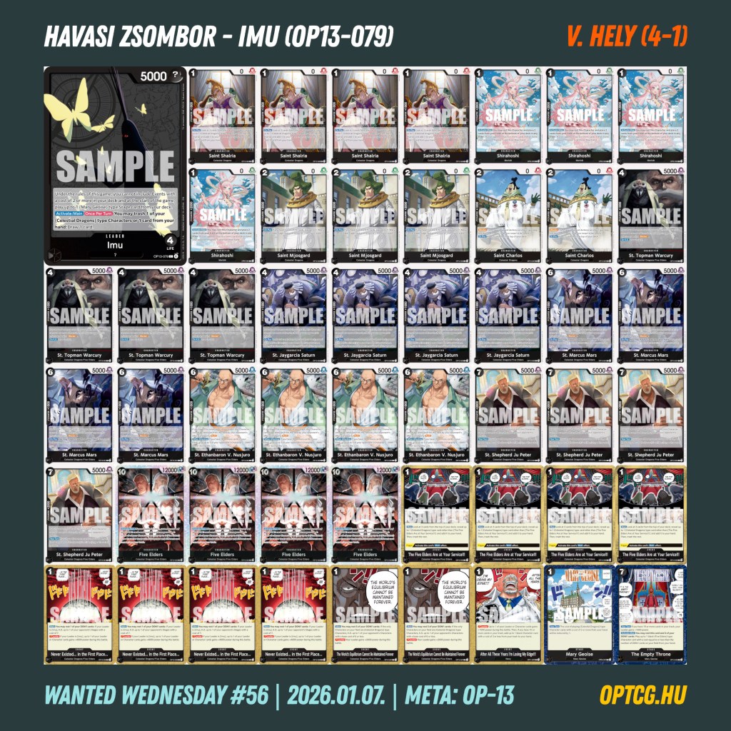 Ahogy az első, úgy az utolsó metás OP-13 versenyt is Imu nyerte, ezúttal Hajdu Roland vezénylésével, a 4-1-es helyekre pedig két UP Luffy is odaért, egy-egy BP Luffy és egy másik Imu mellett. Az első öt helyezett természetesen a novemberi ONE PIECE MASTERS tornára is kvalifikálta magát.