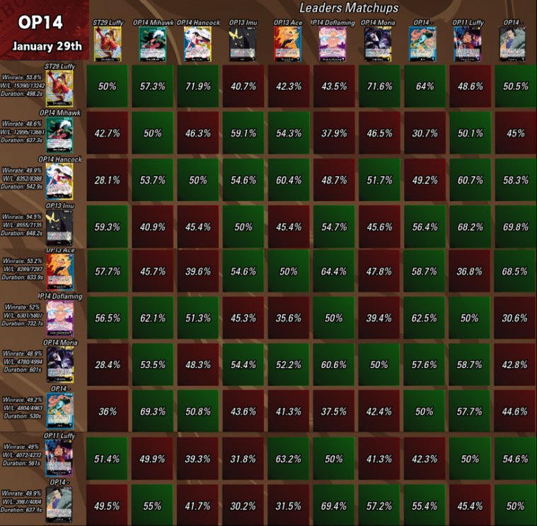 - Dracule Mihawk (OP14-020) – 48,6% / 26 556 meccs