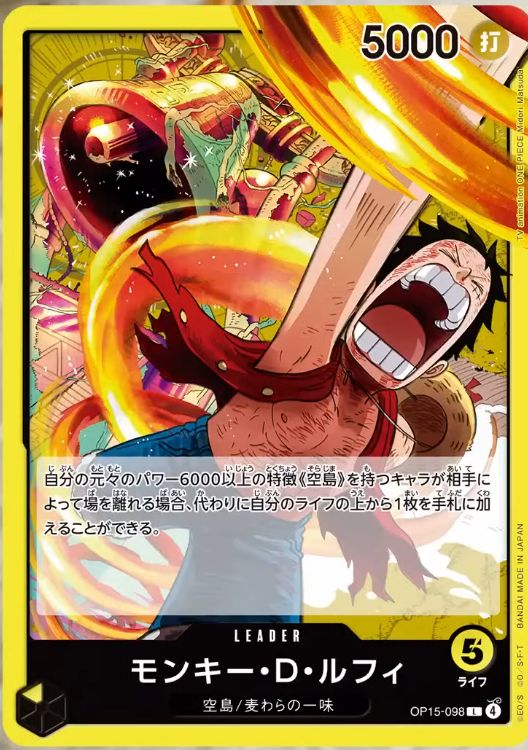 Sky Island / Straw Hat CrewWhen one of your {Sky Island} type characters with an original power of 6000 or greater would be removed from the field by your opponents effects, you may instead place the top card of your life into your hand.