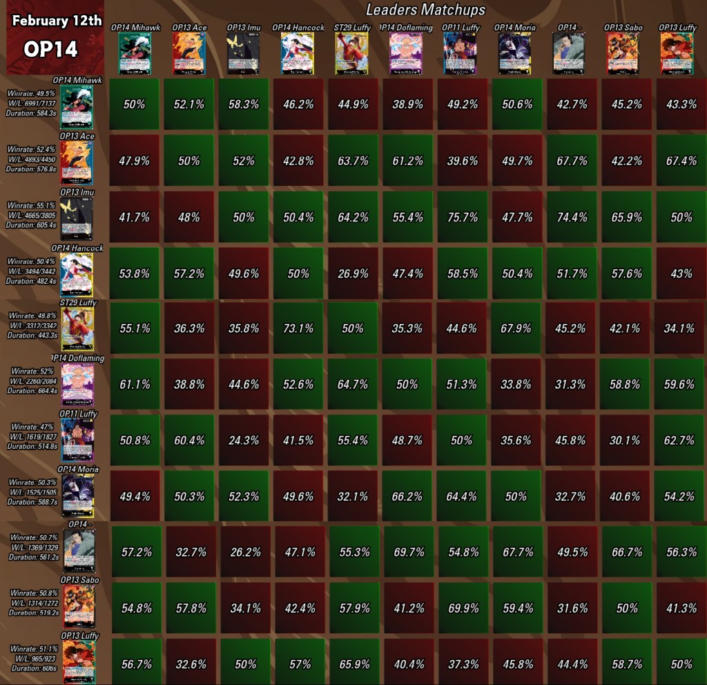A TCG Match Making közzétette legfrissebb kivonatát a One Piece Card Game aktuális metájára vonatkozóan, melynek alapját az OPTCGSim ranked módja, az OPBounty adja. Rovatunkban mi is kizárólag a publikusan elérhető információkra hagyatkozunk – aki még részletesebb statisztikákra kíváncsi, az támogassa őket a Patreonon, és hozzáférést kap a teljes adattáblához.