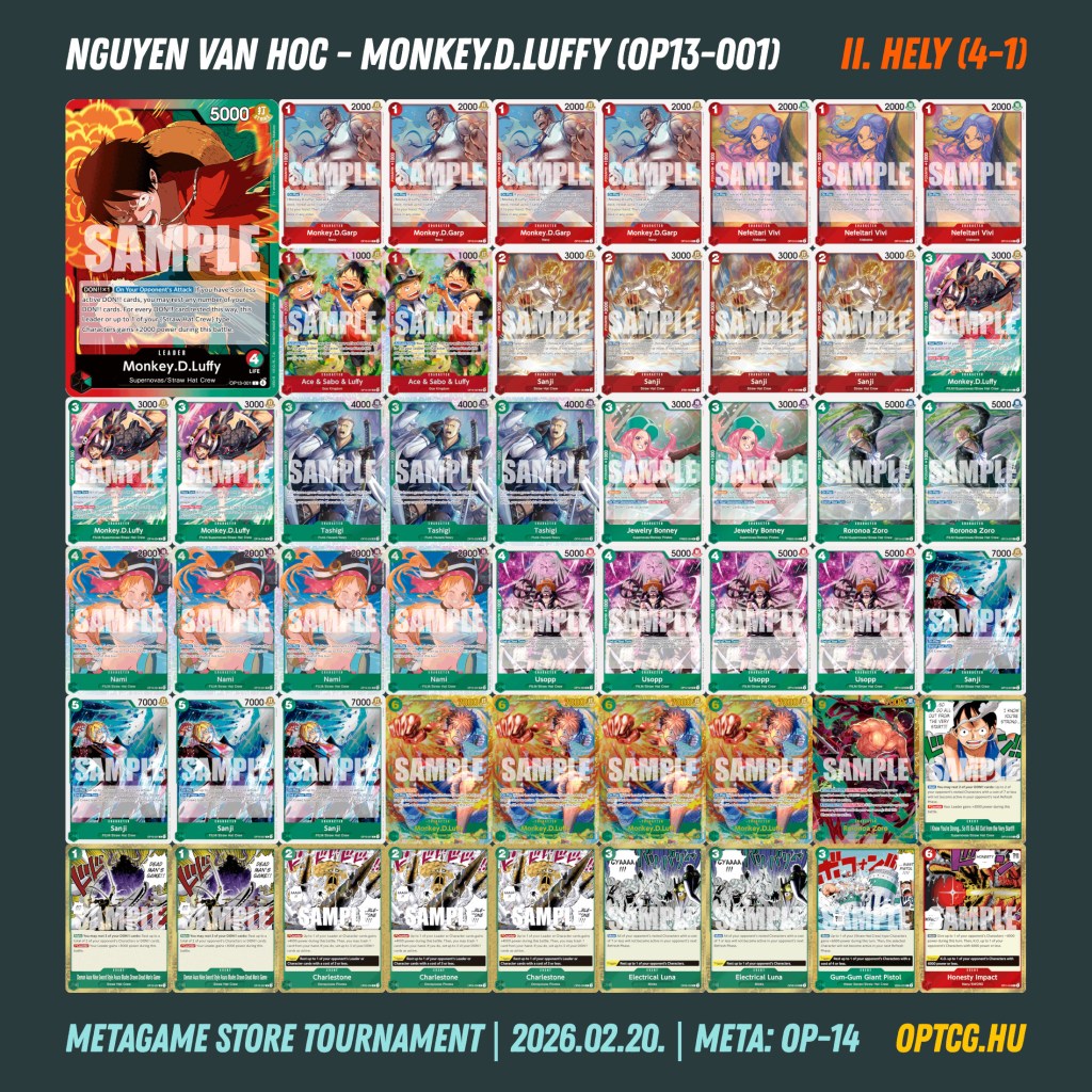Az ötfordulós verseny végül Makó Gergely sikerét hozta, aki pár napon belül a második döntőjét játszotta a frissen életre kelt piros-zöld Law-val, és ezúttal a győzelem is összejött számukra. Egy-egy vereséggel Nguyen Van Hoc (RG Luffy), Kendi János (), Ádám Levente (Mihawk), Sebestyén Krisztián (B Crocodile), Juhász Szabolcs (Y Luffy) és Králl Zoltán (UY Boa) zártak, így az élmezőny most is rendkívül sokszínű lett. Krisztián, Szabolcs és Zoli pedig a ONE PIECE MASTERS kvalifikációt is megszerezték az X-1-es eredménnyel.