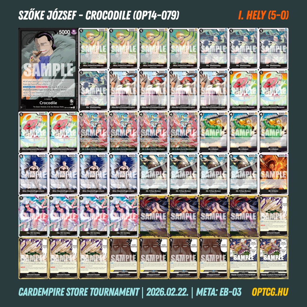 Az említett deckek közül több is odaérhetett volna, az ötfordulós versenyt azonban végül egy fekete Crocodile nyerte Szőke József vezényletével, aki Kendi János UP Sanjija mellett Ádám Levente és Mikulás Ádám Vivijeit, illetve Besenyei Martin Namiját tartóztatta fel. Dzsozi a győzelem mellett a ONE PIECE MASTERS kvalifikációt is megszerezte ezzel az eredménnyel, akárcsak Martin – már több mint 50 játékos abszolválta a kihívást.