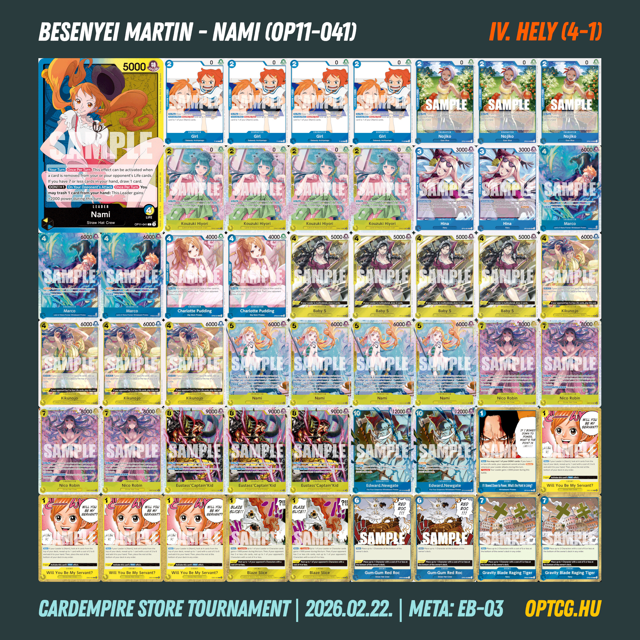 Február 22-én a CardEmpire hétvégi lokálján startolt el itthon az EB-03 meta, ami – a komoly laphiány ellenére is – nagy érdeklődést hozott, hiszen 26 játékos szállt harcba a nyereményekért, meg persze hogy élesben is tesztelje az új paklikat. Kísérletező kedvben pedig nem volt hiány, ahogy az az alábbi lista alapján is leszűrhető: