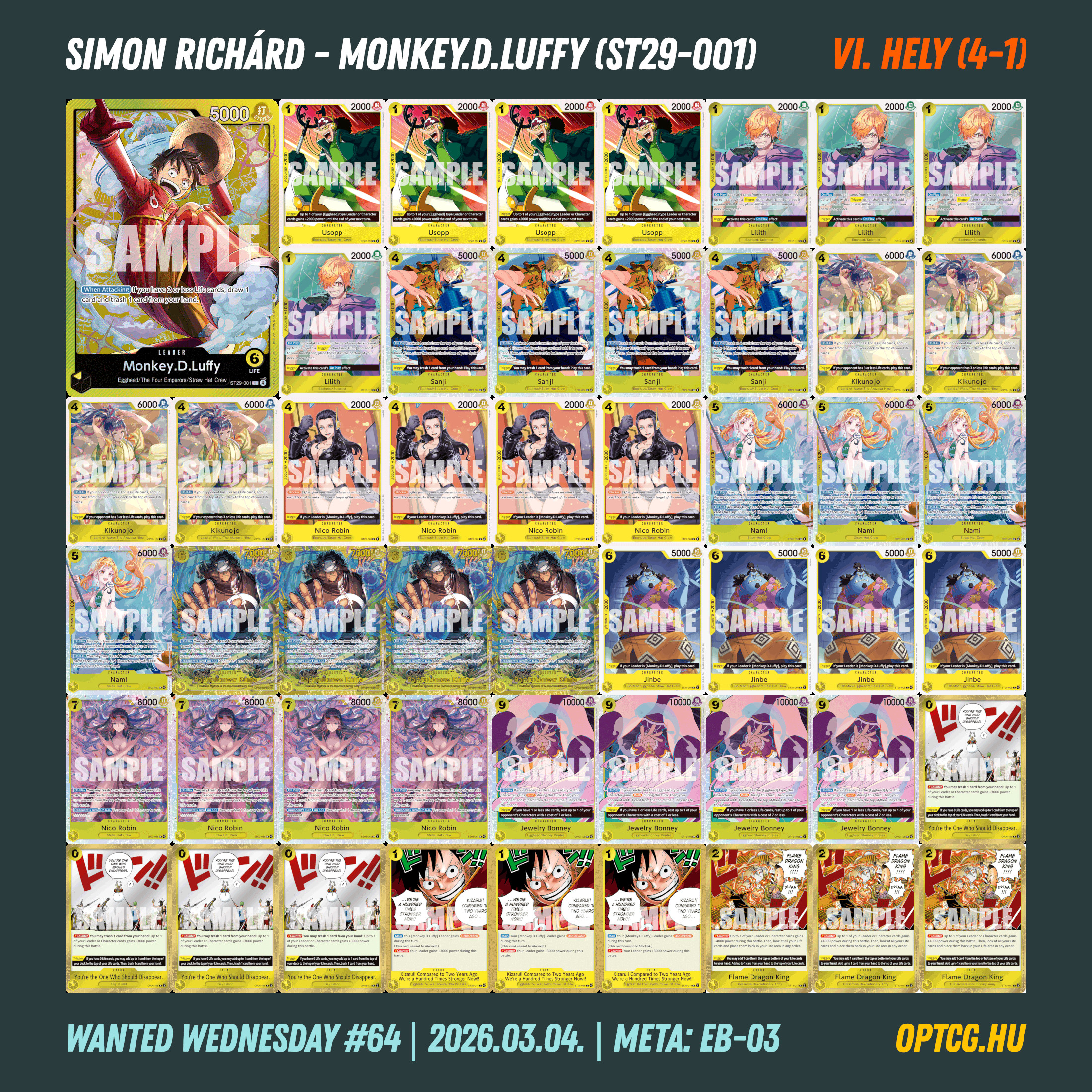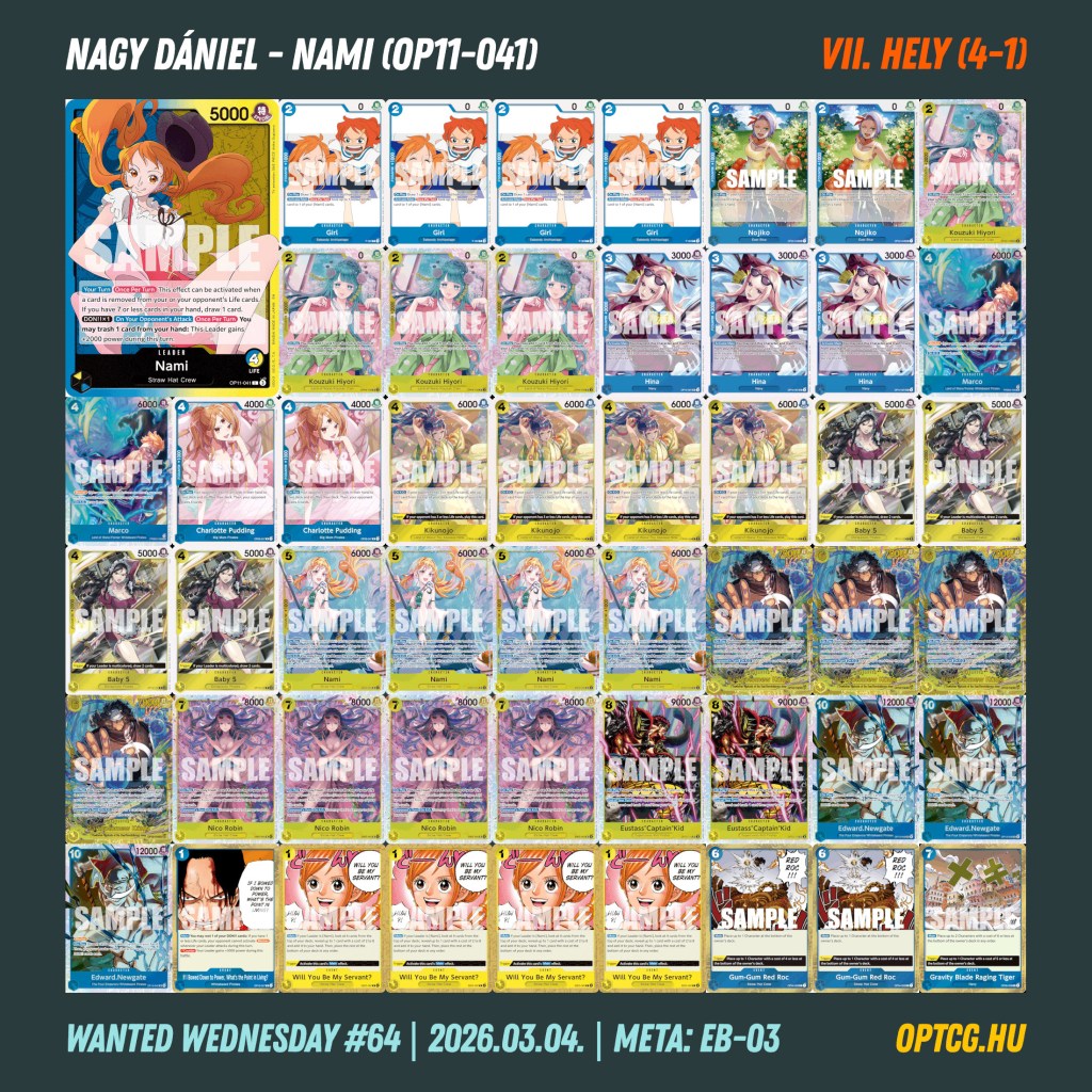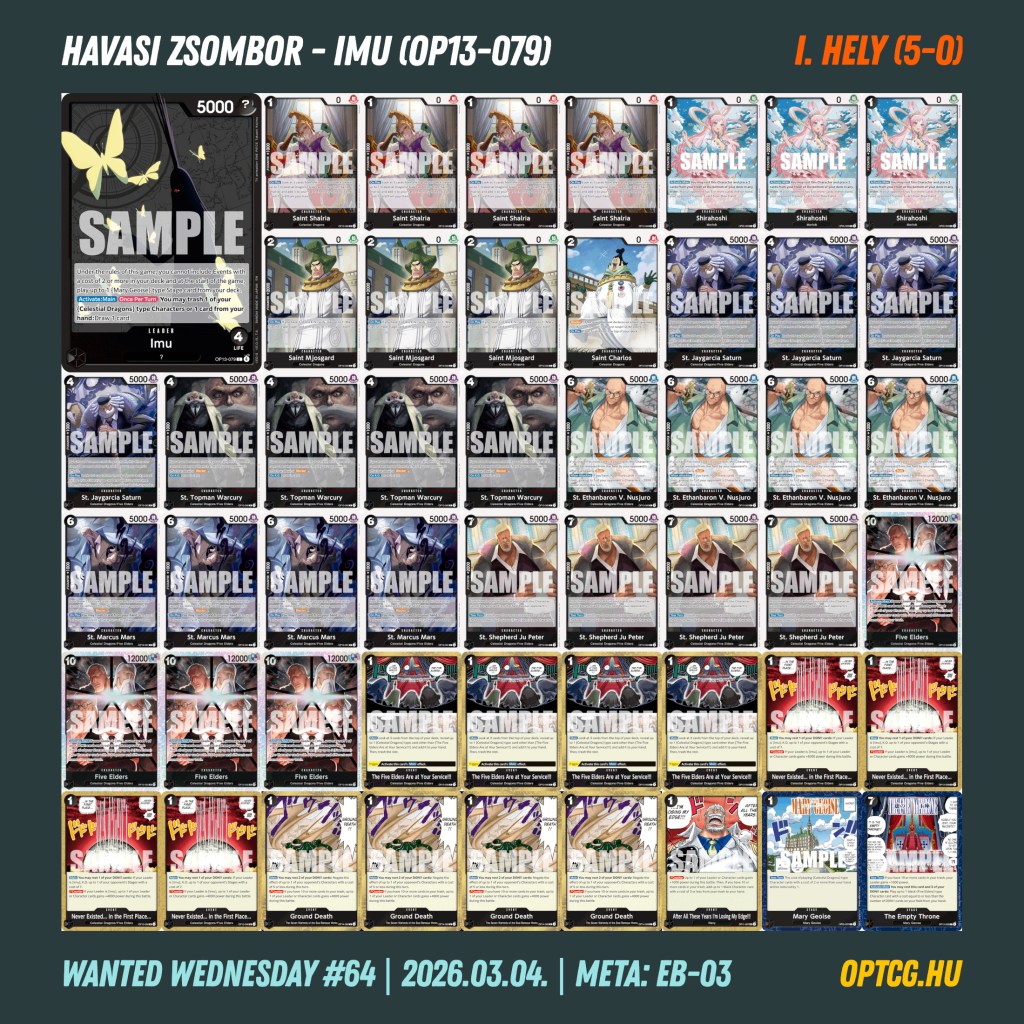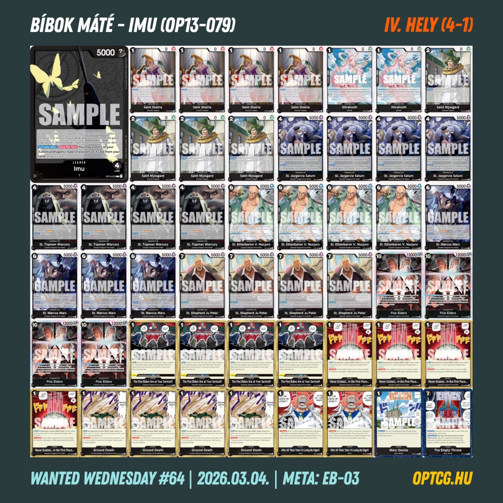 Az élmezőny végül igen érdekesen alakult: a győztes Havasi Zsombor lett Imuval, aki Makó Gergely RG Law-ját verte meg a fináléban, a 4-1-es helyekre pedig további két Imu, illetve egy Ace is odafért Bíbok Máté, Sánta Botond és Ádám Levente révén, így sikerült kicsit megidézni az OP-13 metát. Simon Richárd (sárga Luffy) és Nagy Dániel (kék-sárga Nami) is egy vereséggel zárták a napot – a ONE PIECE MASTERS kvalifikáció Máté és Ricsi számára jött össze ezen a versenyen.