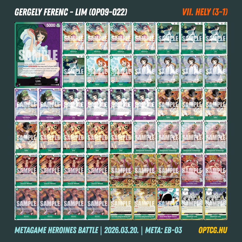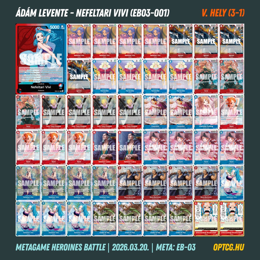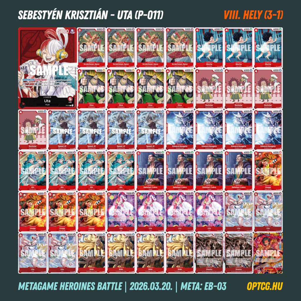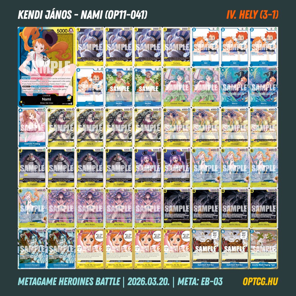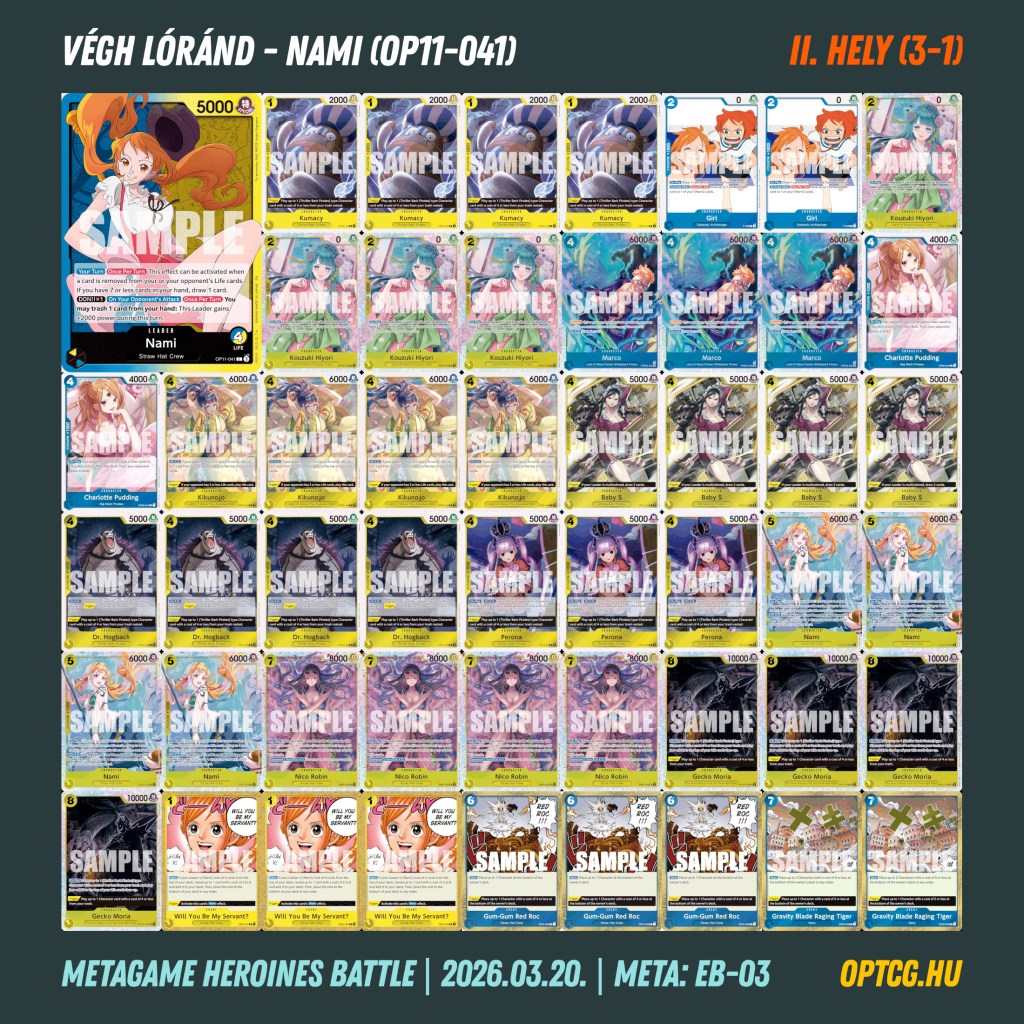 Március 20-án, pénteken a második Heroines Battle eventjét is megtartotta a Metagame, melyen 24 játékos gyűlt össze, hogy újból kiderüljön, melyik jelenleg a legjobb női Leader a One Piece Card Game-ben. Íme a felhozatal: