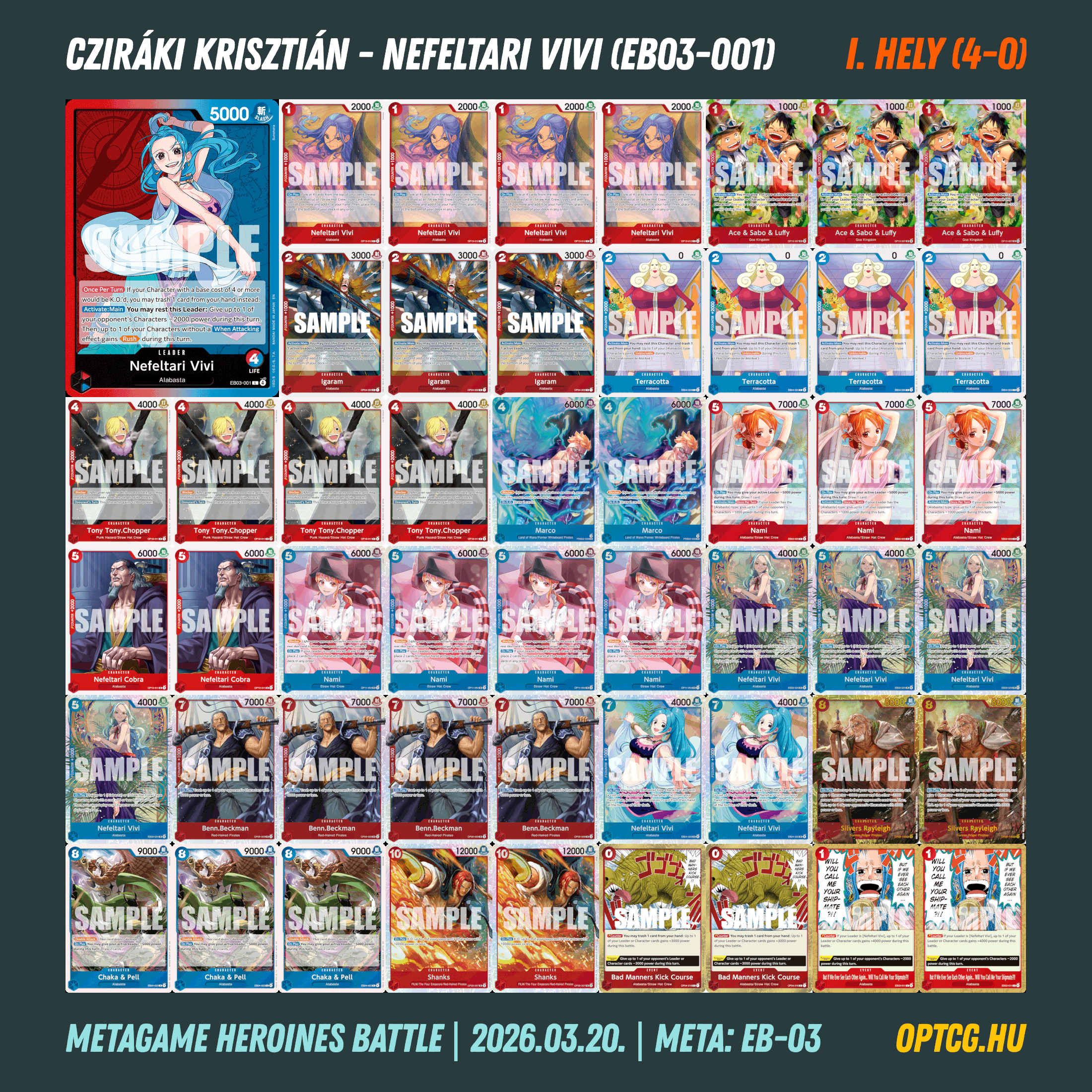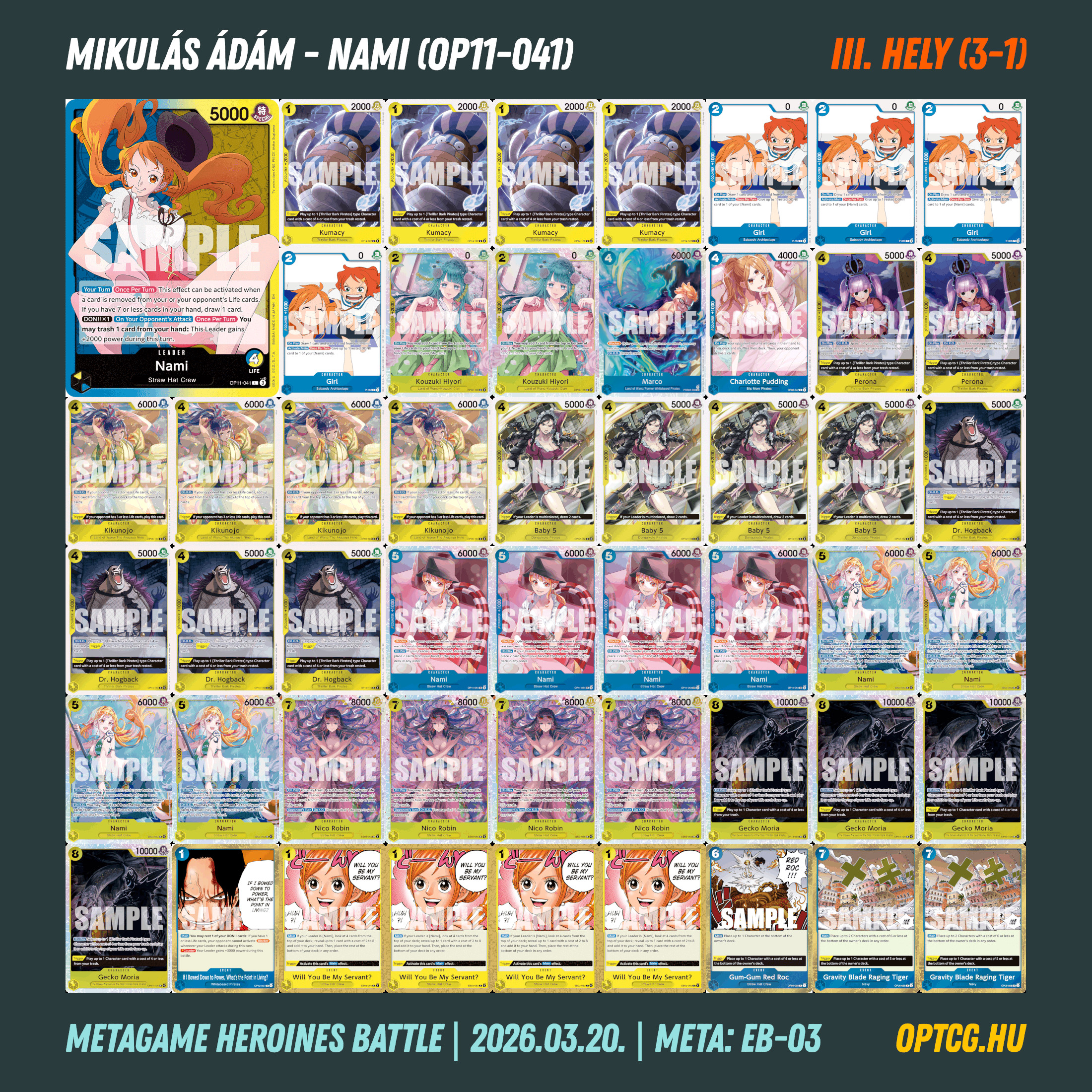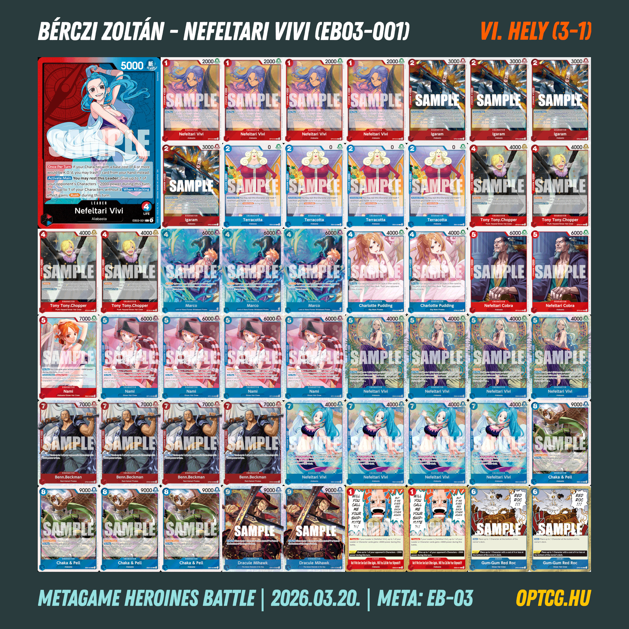 Március 20-án, pénteken a második Heroines Battle eventjét is megtartotta a Metagame, melyen 24 játékos gyűlt össze, hogy újból kiderüljön, melyik jelenleg a legjobb női Leader a One Piece Card Game-ben. Íme a felhozatal: