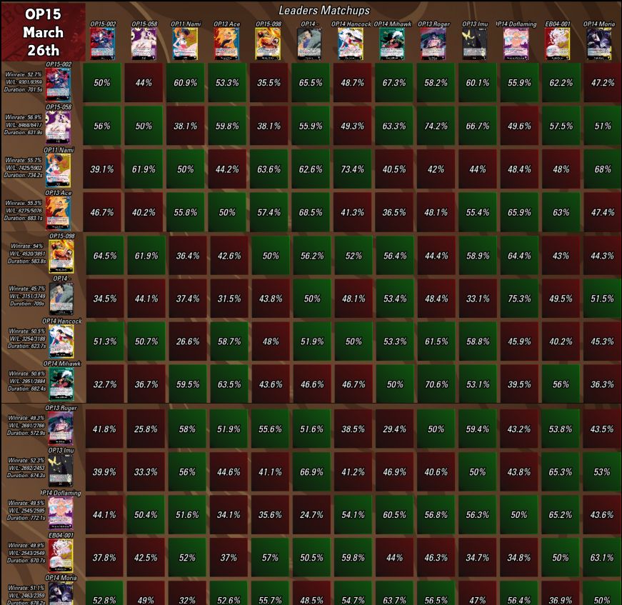 A TCG Match Making közzétette legfrissebb kivonatát a One Piece Card Game aktuális metájára vonatkozóan, melynek alapját az OPTCGSim ranked módja, az OPBounty adja. Rovatunkban mi is kizárólag a publikusan elérhető információkra hagyatkozunk – aki még részletesebb statisztikákra kíváncsi, az támogassa őket a Patreonon, és hozzáférést kap a teljes adattáblához.