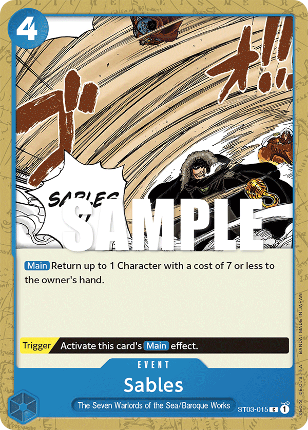 Az egész kirotáló készlet talán legfontosabb lapja a Gum-Gum Red Roc, amivel a játék leguniverzálisabb bármit vivő leszedése köszön le. A kék szín nagy erősségéből, a nem KO-alapú leszedések közül nem csak ő búcsúzik ráadásul: a főleg UP Luffyban terrorizáló 9-es Mihawk, valamint a vissza-visszatérő tech páros, a 7-es Doffy és a Sables is jól kezeltek olyan aktuális sztárokat, mint a sárga 7-es Nico Robin. A Seven Warlords-package-ből egy 2K counter (Mihawk), egy olcsó blocker (Law) és egy univerzális 4-cost (Moria) is leköszön, mint ahogy a TCG-trademarknak számító “3-ért húzok 2-t” itteni úttörője, a Sanji’s Pilaf is.