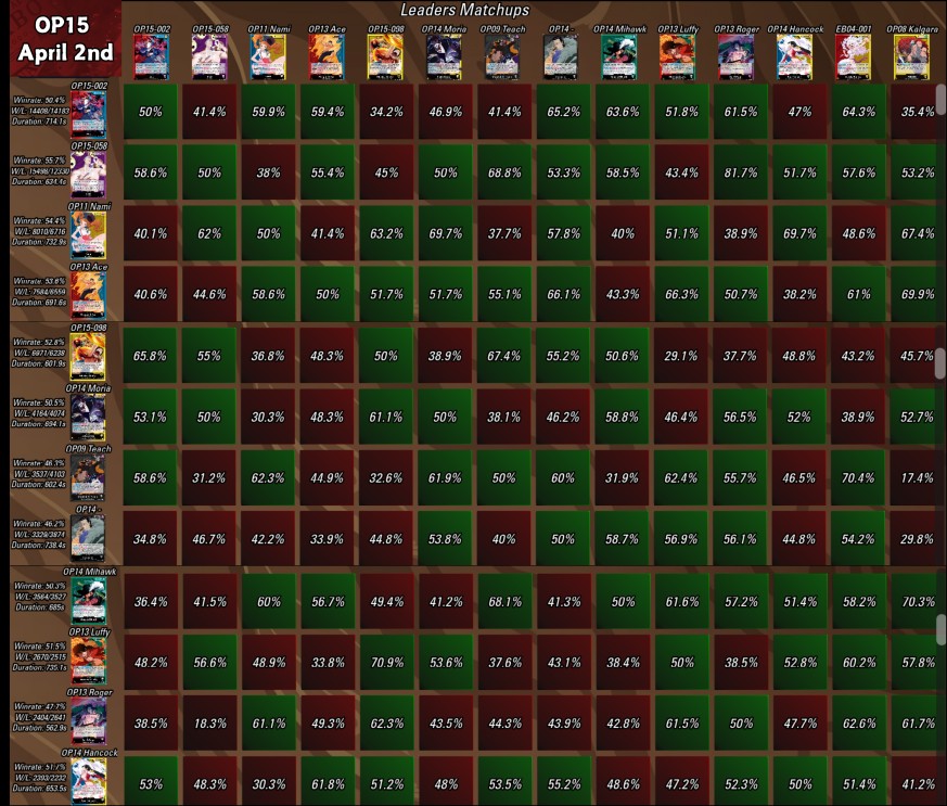 A TCG Match Making közzétette legfrissebb kivonatát a One Piece Card Game aktuális metájára vonatkozóan, melynek alapját az OPTCGSim ranked módja, az OPBounty adja. Rovatunkban mi is kizárólag a publikusan elérhető információkra hagyatkozunk – aki még részletesebb statisztikákra kíváncsi, az támogassa őket a Patreonon, és hozzáférést kap a teljes adattáblához.