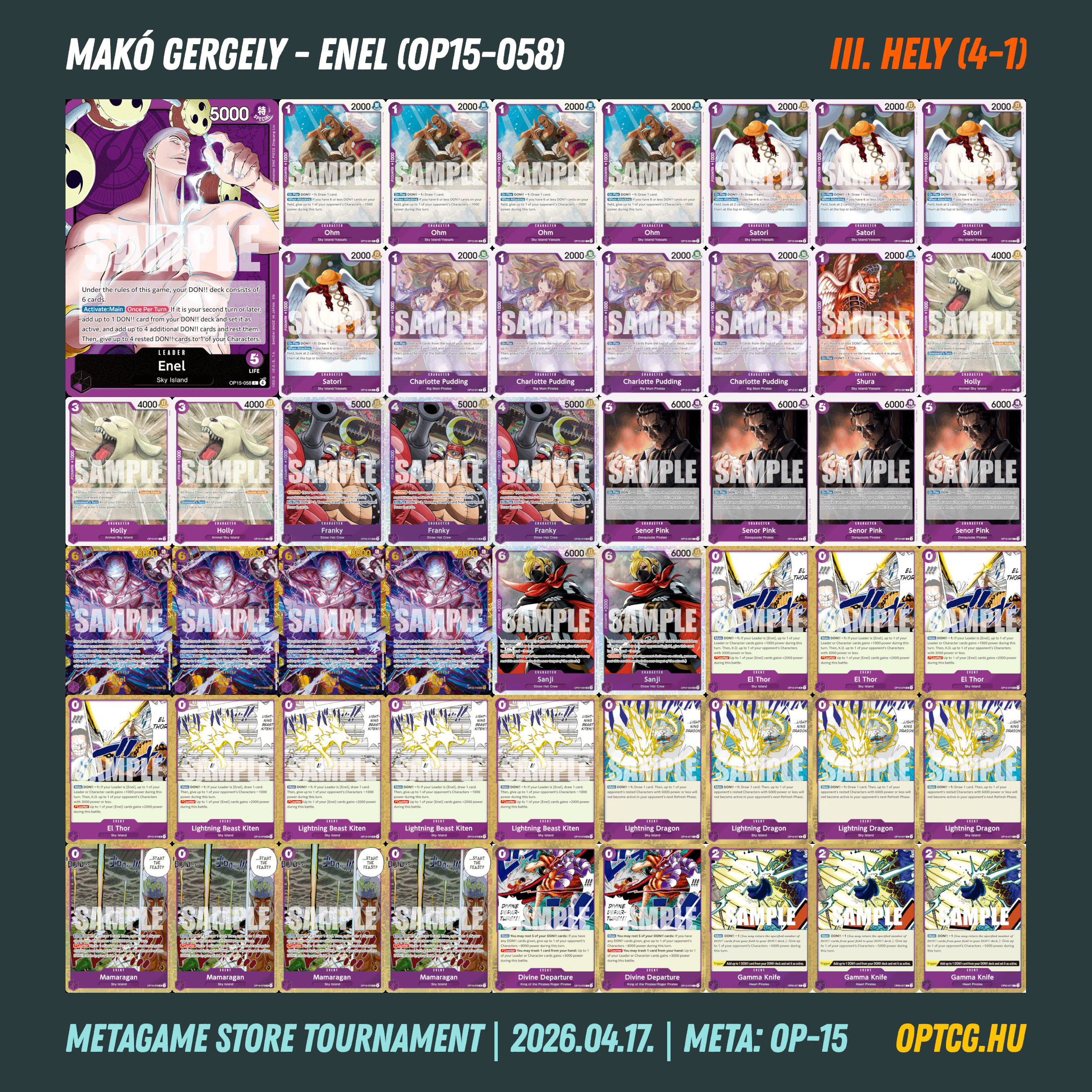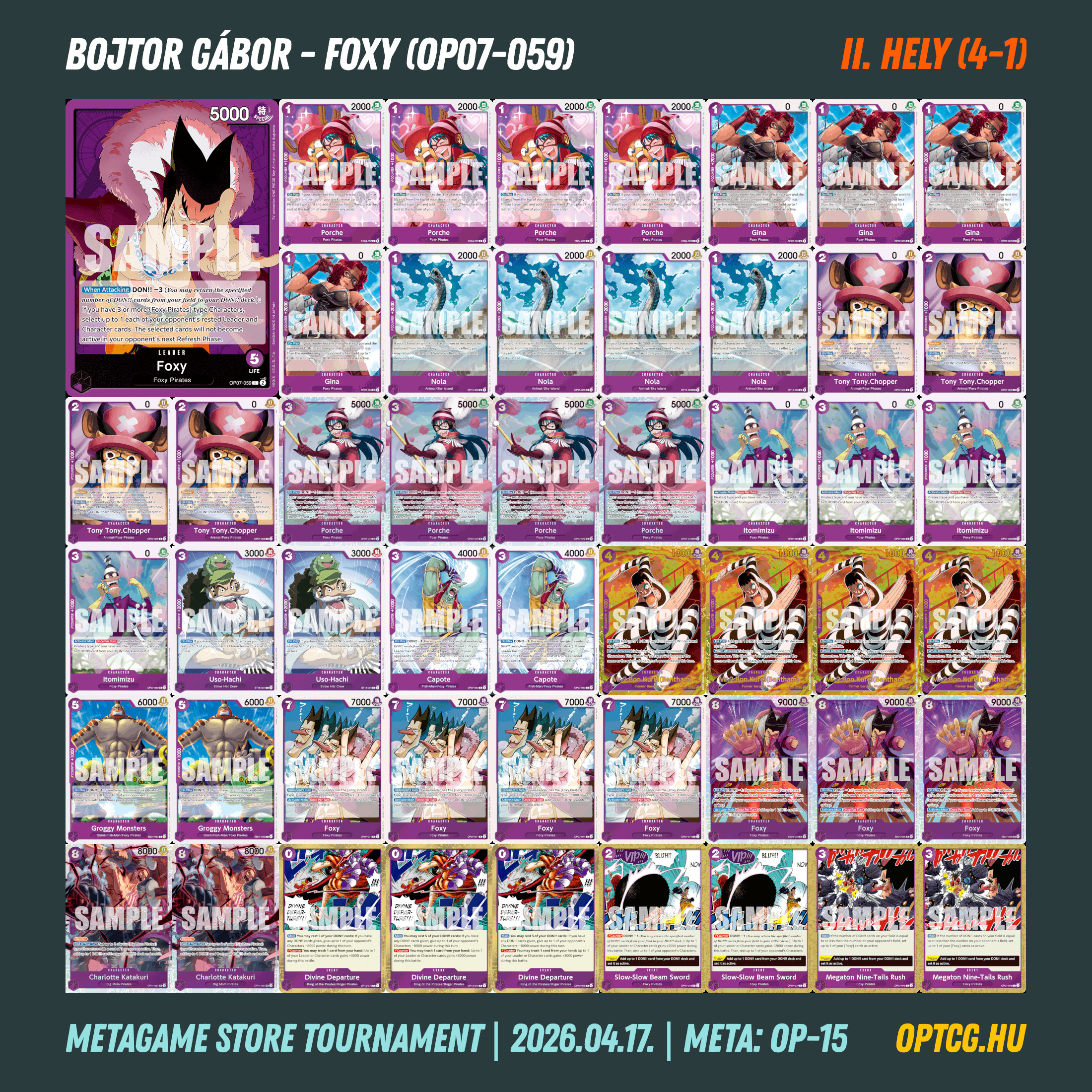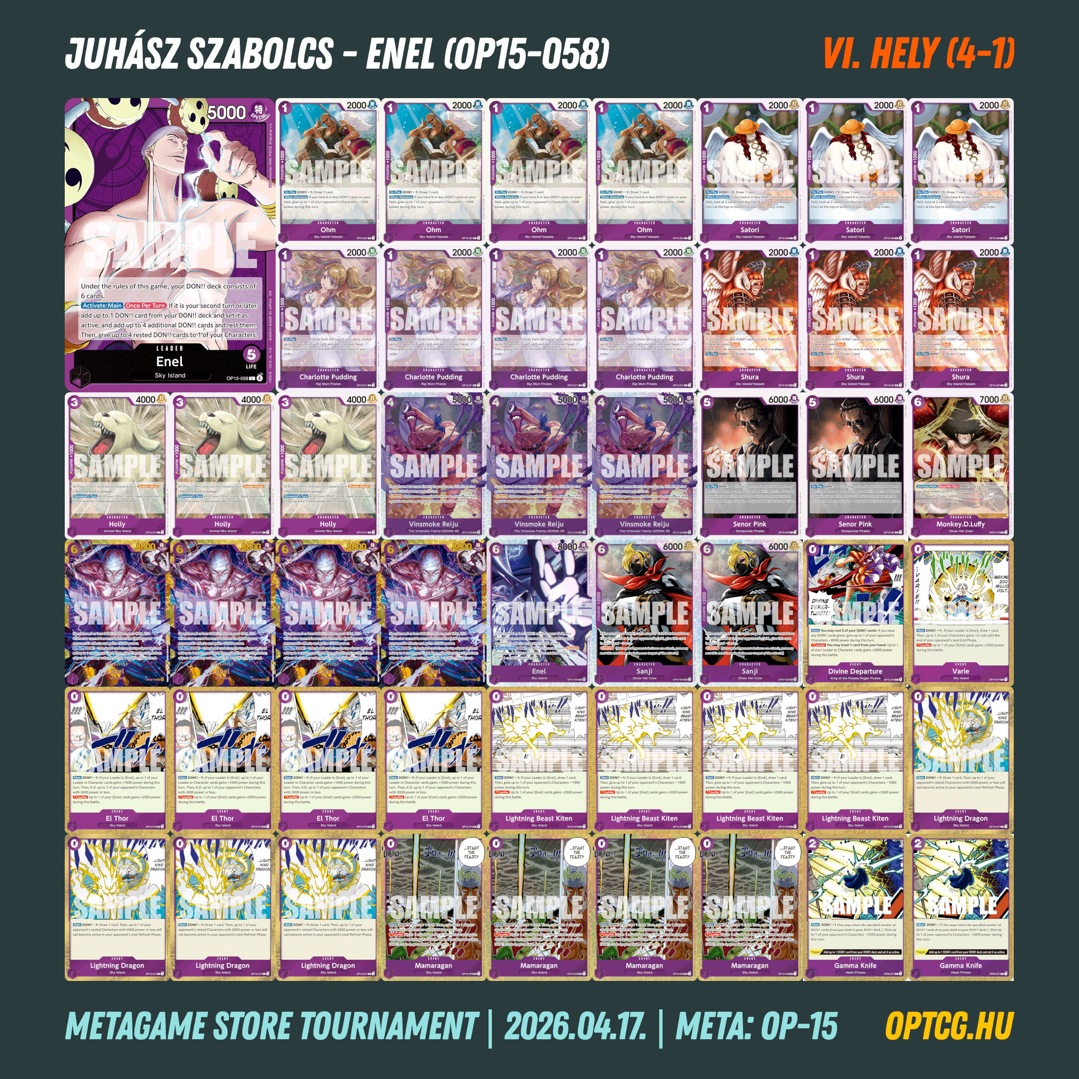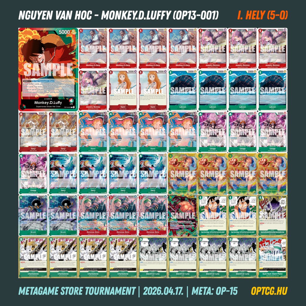 Az ötfordulós versenyen Nguyen Van Hoc szerezte meg a győzelmet, egy RG Luffyt sikerre vezetve – erős napot zárt ez a Leader, hiszen a másik ilyen deck is az élmezőnyben végzett. A 4-1-es helyekre egy Foxy, két Enel és egy zöld Jinbe fért még oda, így ezúttal a lila és a zöld színek domináltak.