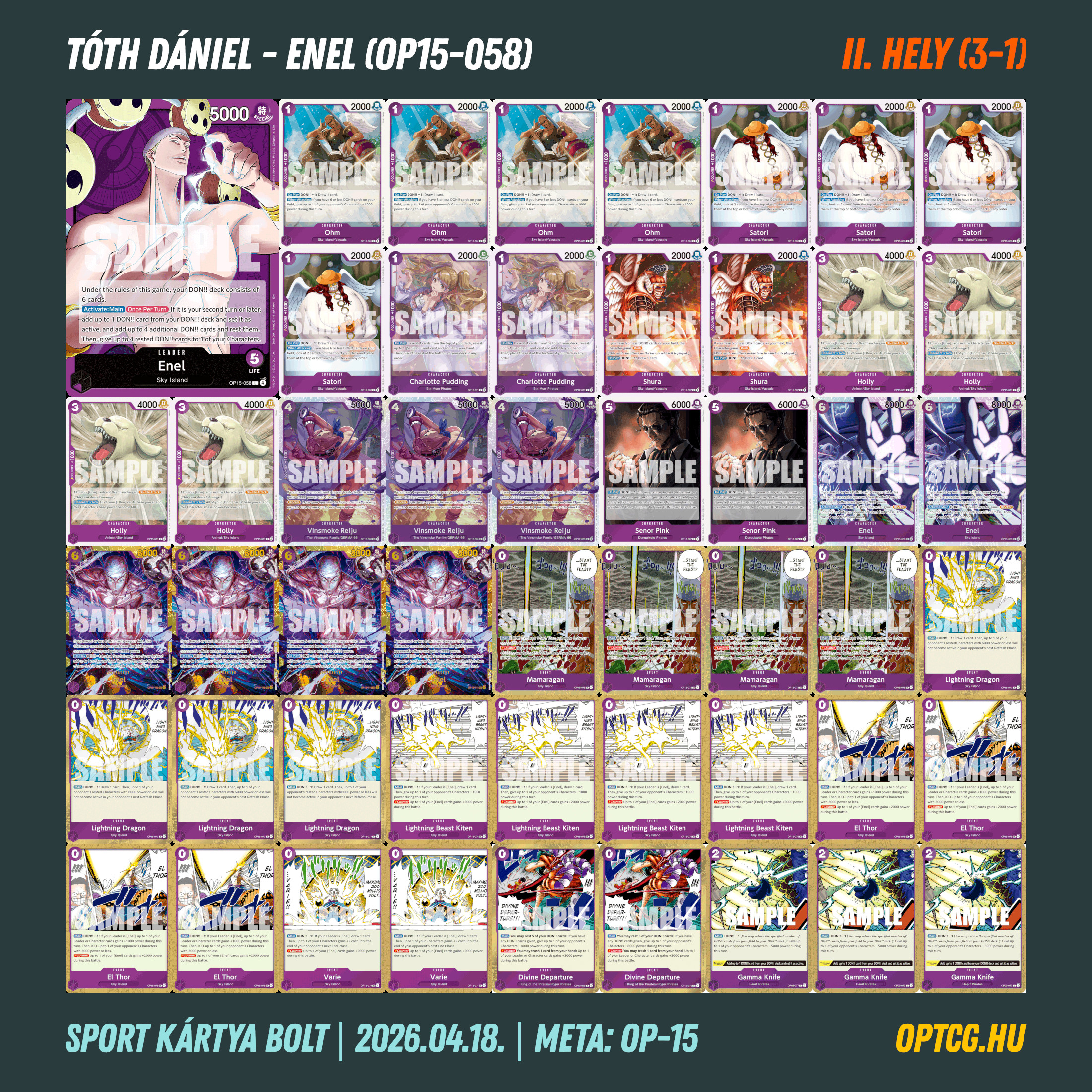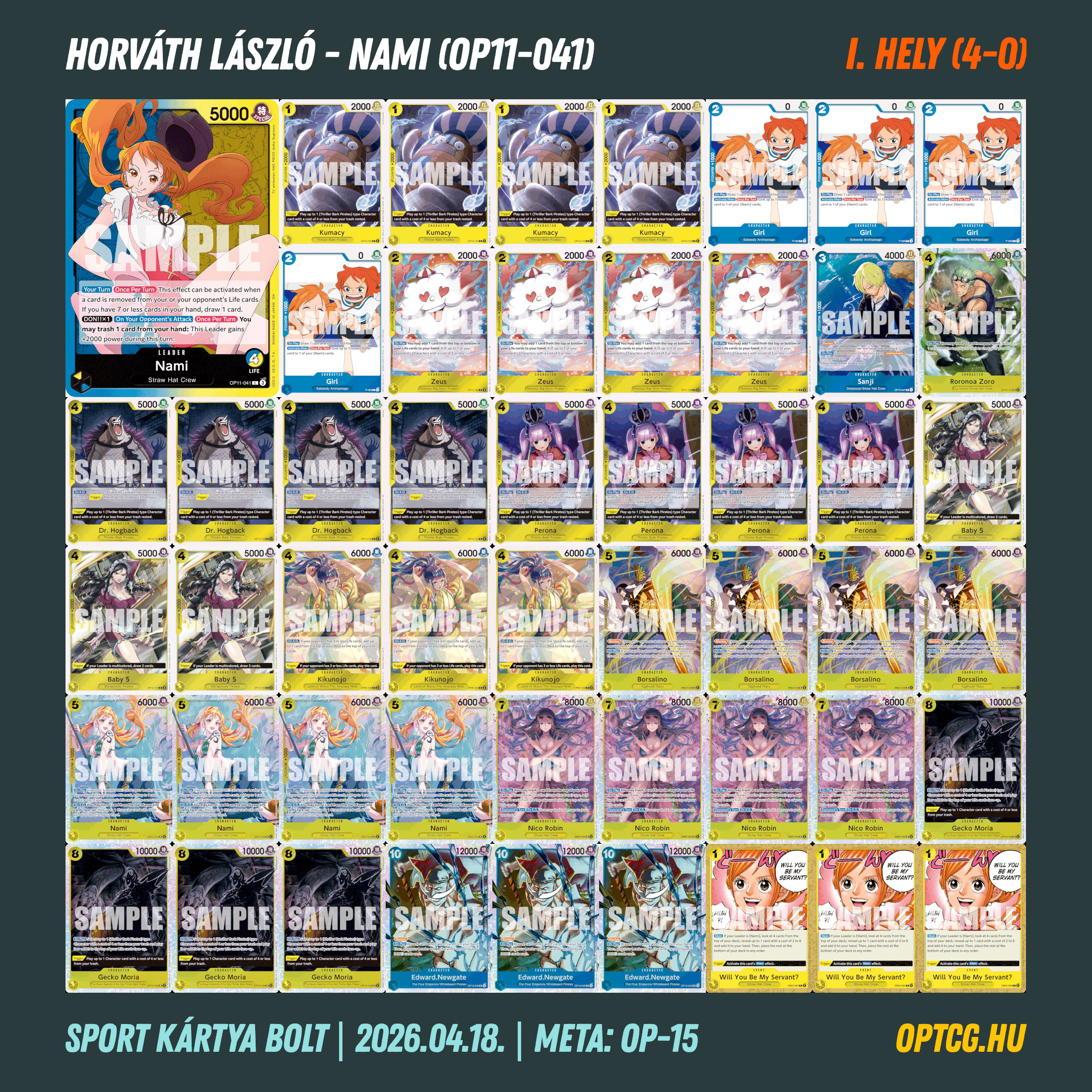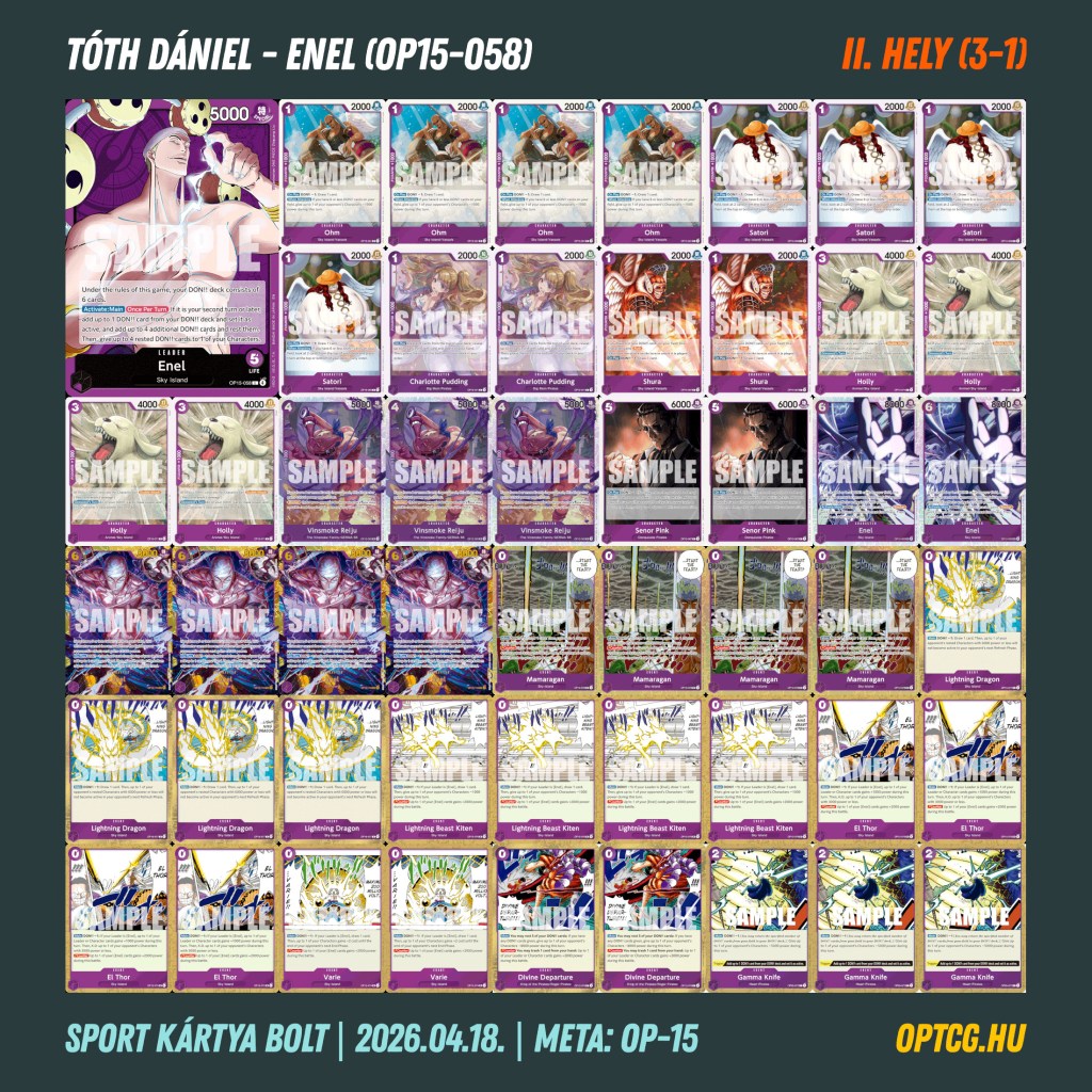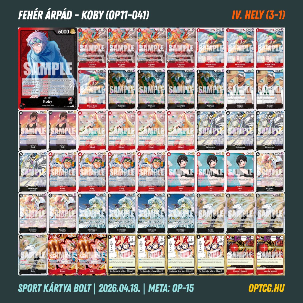 Április 18-án a veszprémi Sport Kártya Bolt is megtartotta első OP-15-ös formátumú One Piece-versenyét, melyen 14 játékos vett részt, köztük újak, veteránok és visszatérők egyaránt.